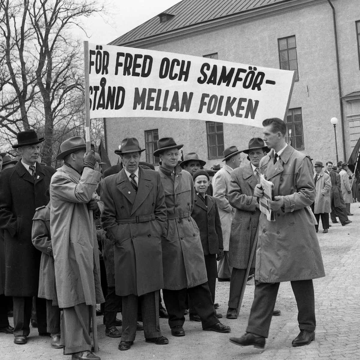 Samling på yttre borggården inför förstamajdemonstrationen 1956. En av årets huvudparoller var För fred och samförstånd mellan folken. En paroll var allvar belystes av att kalla kriget pågick och att det bara var 11 år sedan andra världskriget slutade.