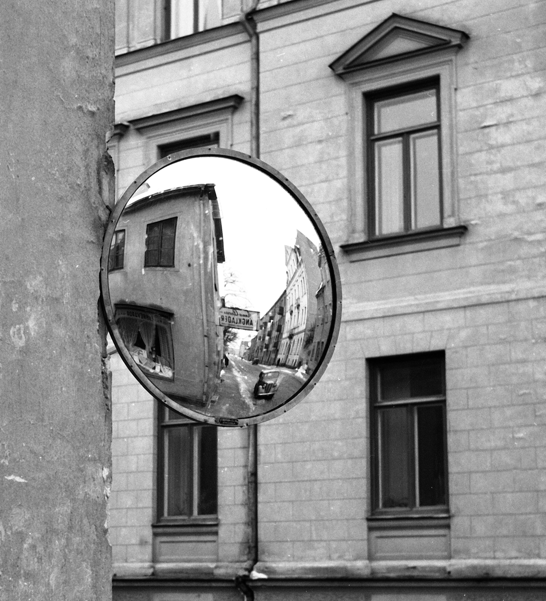 Hörnet Repslagaregaten - Drottninggatan har en spegel för att minska bilolyckorna i korsningen.