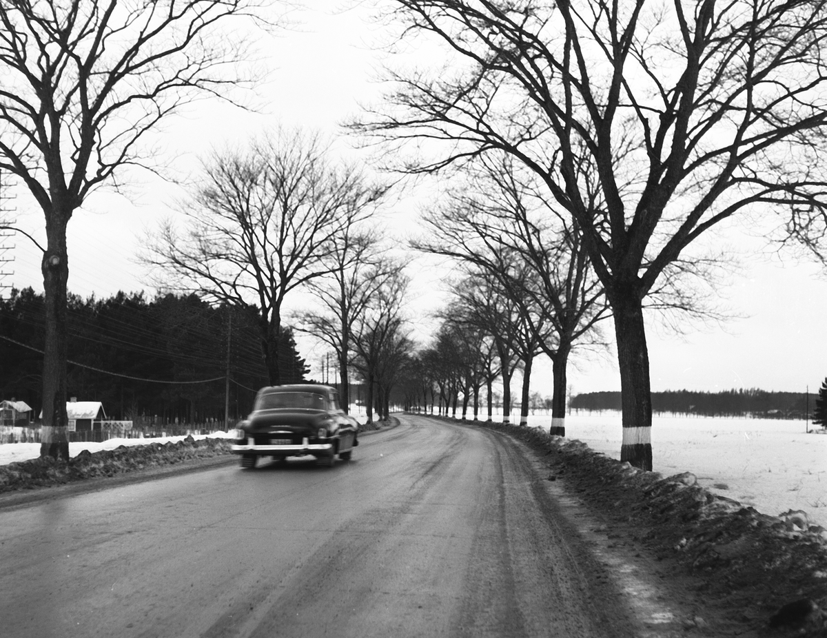 Malmslättsvägen sedd mot väster. Fotografen stod där Malmslättsvägen idag ansluter från väster mot Vallarondellen. Till vänster ser man Valla koloniområde. 1950-tal.