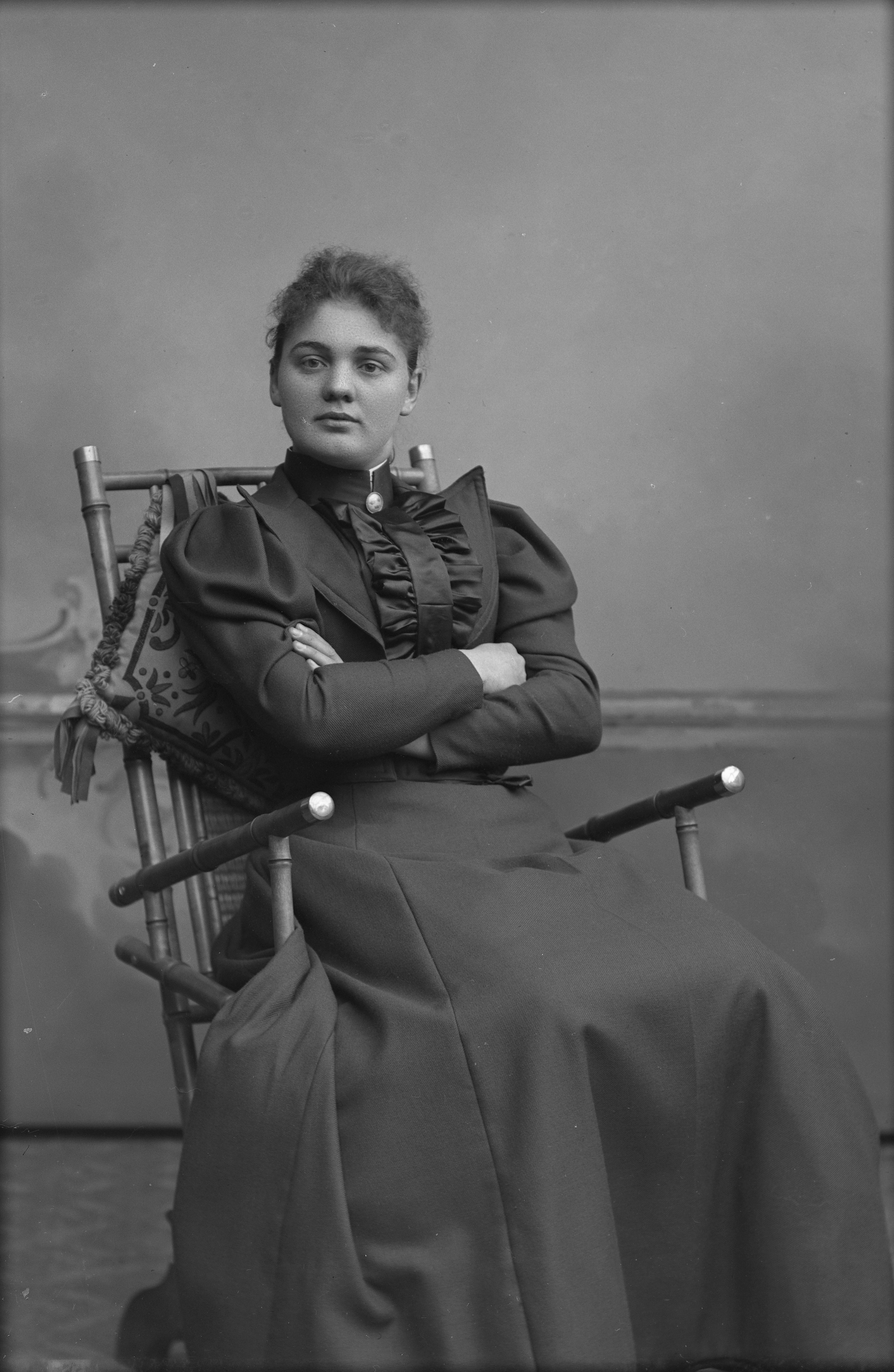 Porträtt i helfigur av fröken Holmquist, sittande i stol med armarna i kors.