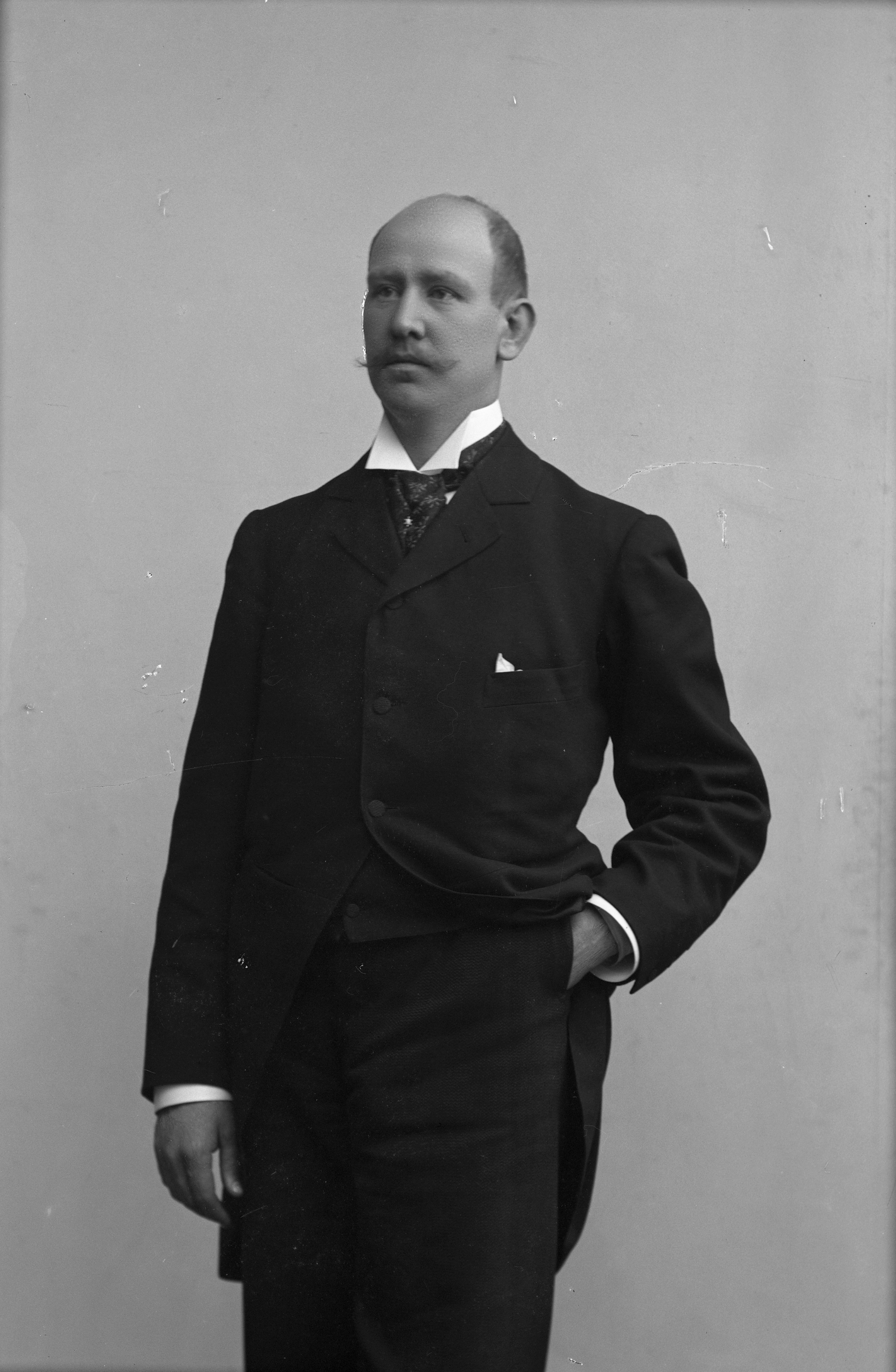 Porträtt i helfigur av Frans Weiland, hållande ena handen i rockfickan.