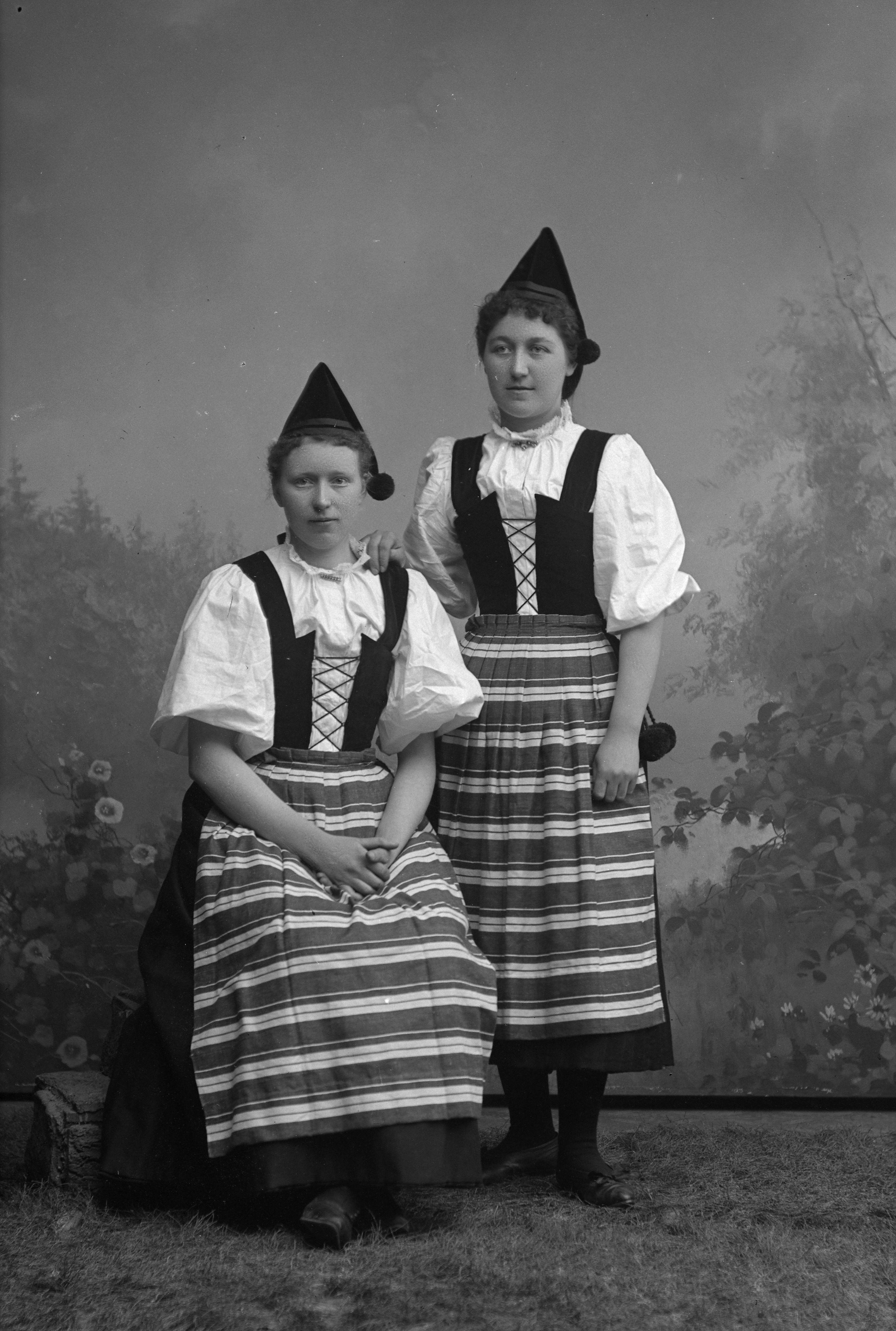 Porträtt i helfigur av Emilia och Maria Flink, iklädda folkdräkter. En av systranrna sittande. Fotograferade framför ateljéfond med skogs- och blomstermotiv.