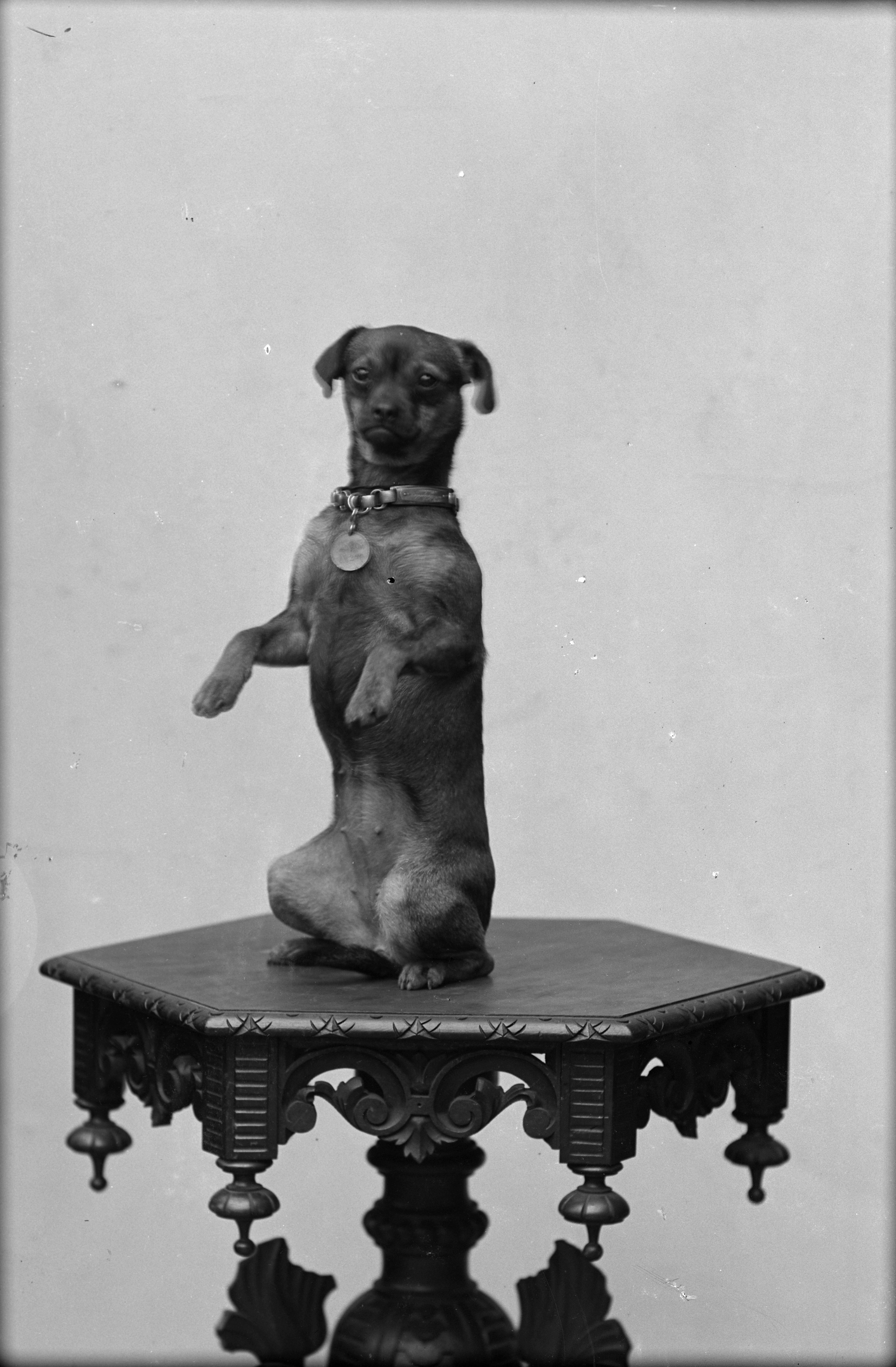 Porträtt av fröken Rosvalls hund, stående på bakbenen, på bord.