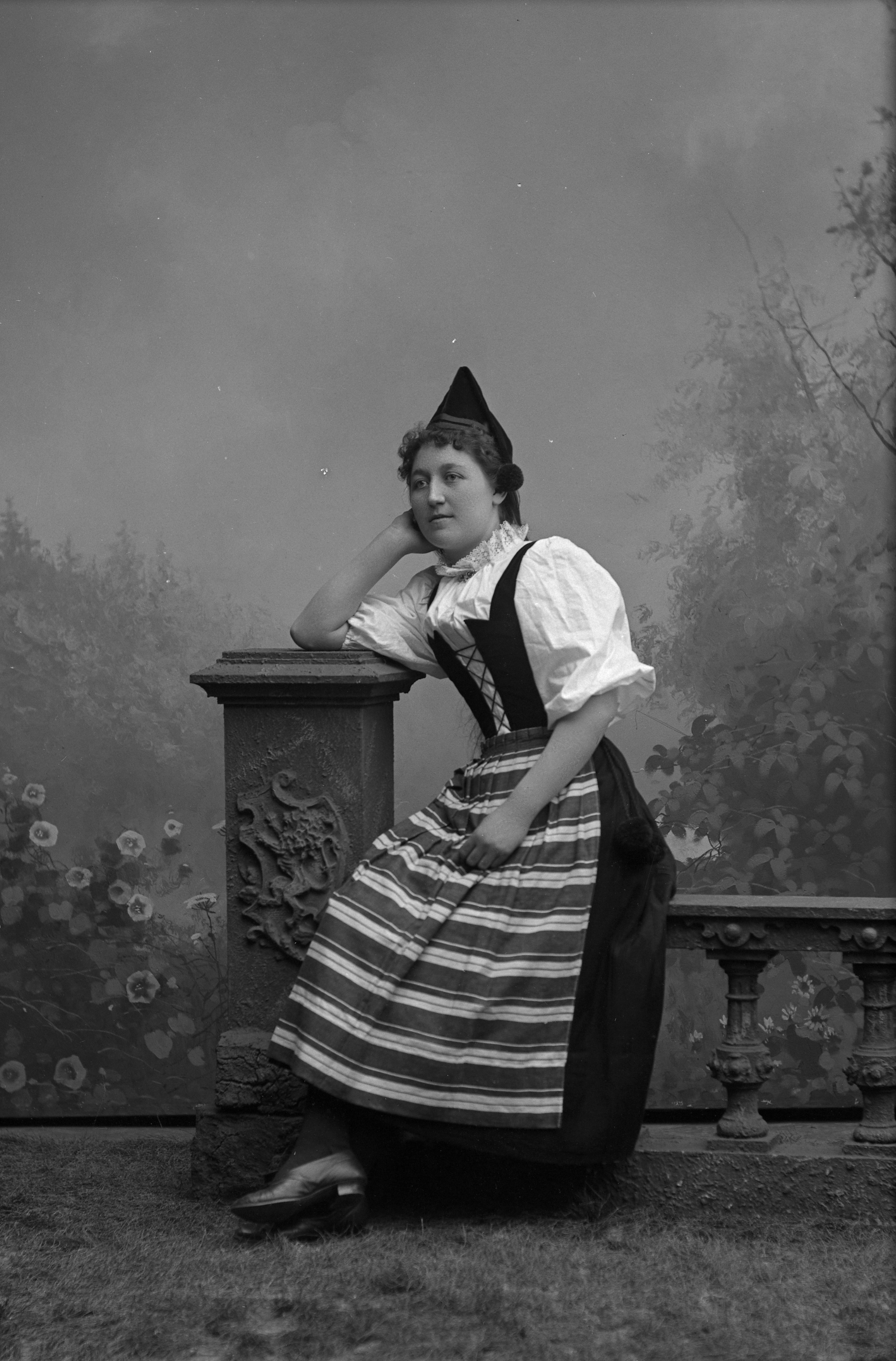 Porträtt i helfigur av Emilia Flink, iklädd folkdräkt, sittande på stenstaket med balustrad. Fotograferad framför ateljéfond med skogs- och blomstermotiv.