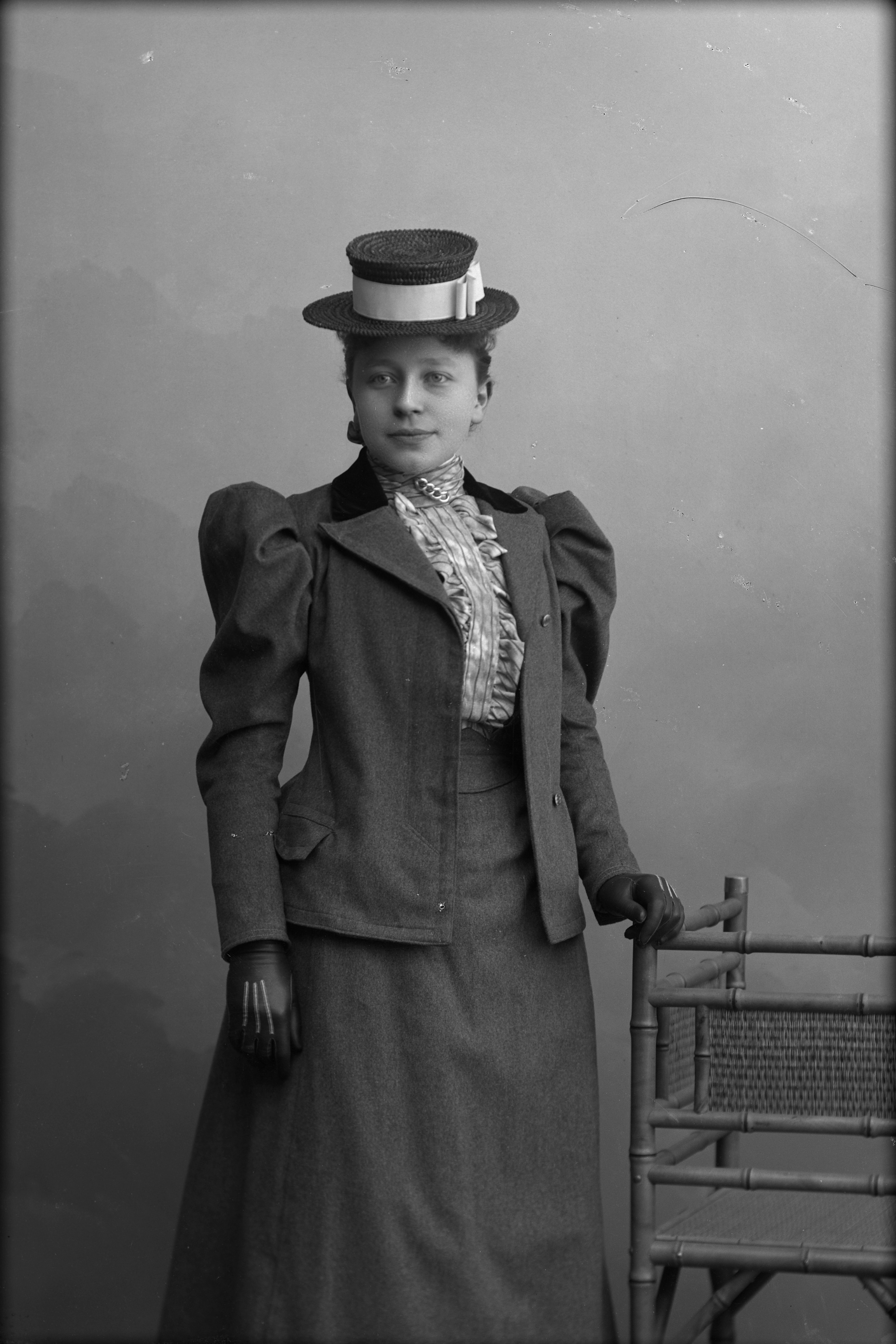 Porträtt i helfigur av fröken Vernerson, iklädd hatt och kappa, stående vid stol.
