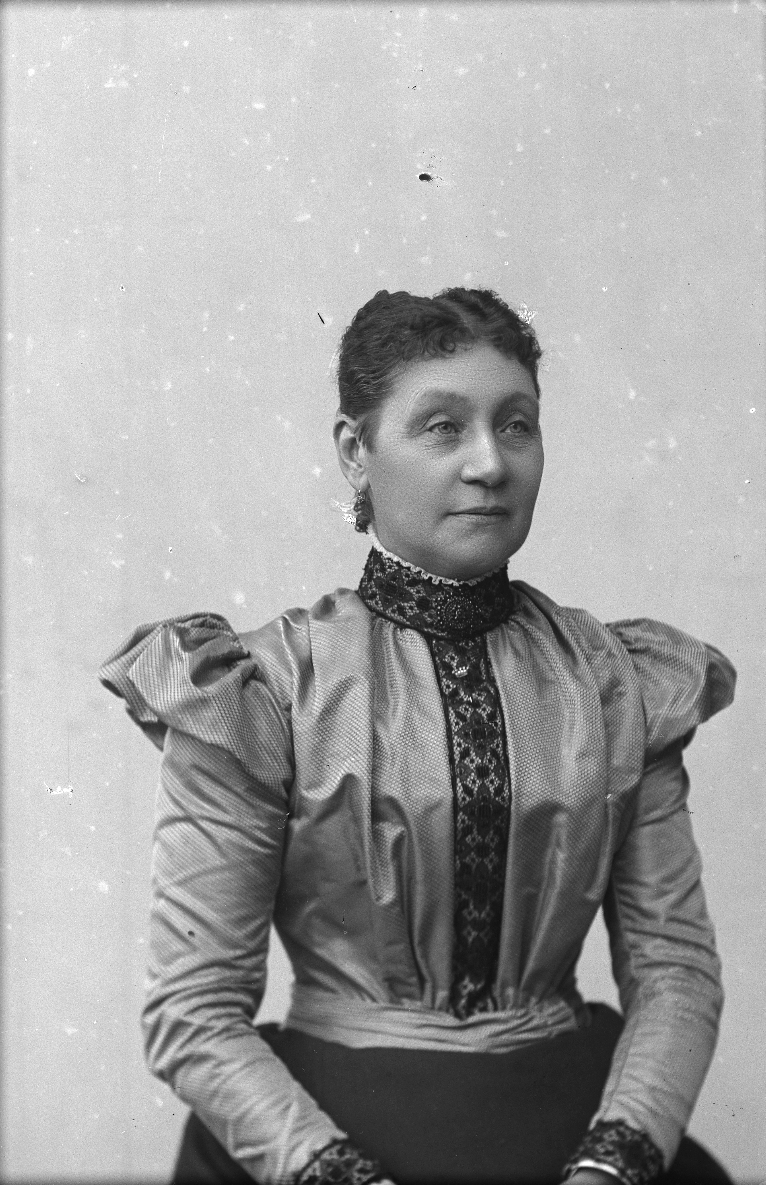 Beskrivning: Porträtt i halvfigur av Ida Jönsson eller Sophie Nordstrand.