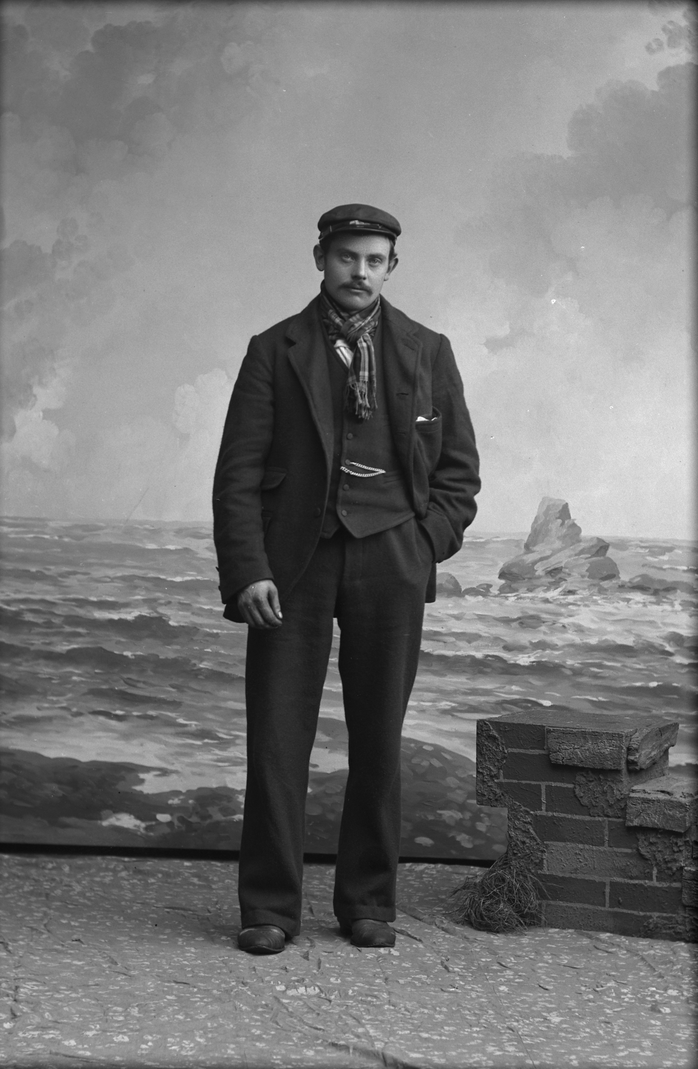 Porträtt i helfigur av sjömannen Albert Andersson, iklädd keps, stående vid stenmur. Fotograferad framför ateljéfond med landskapsmotiv.