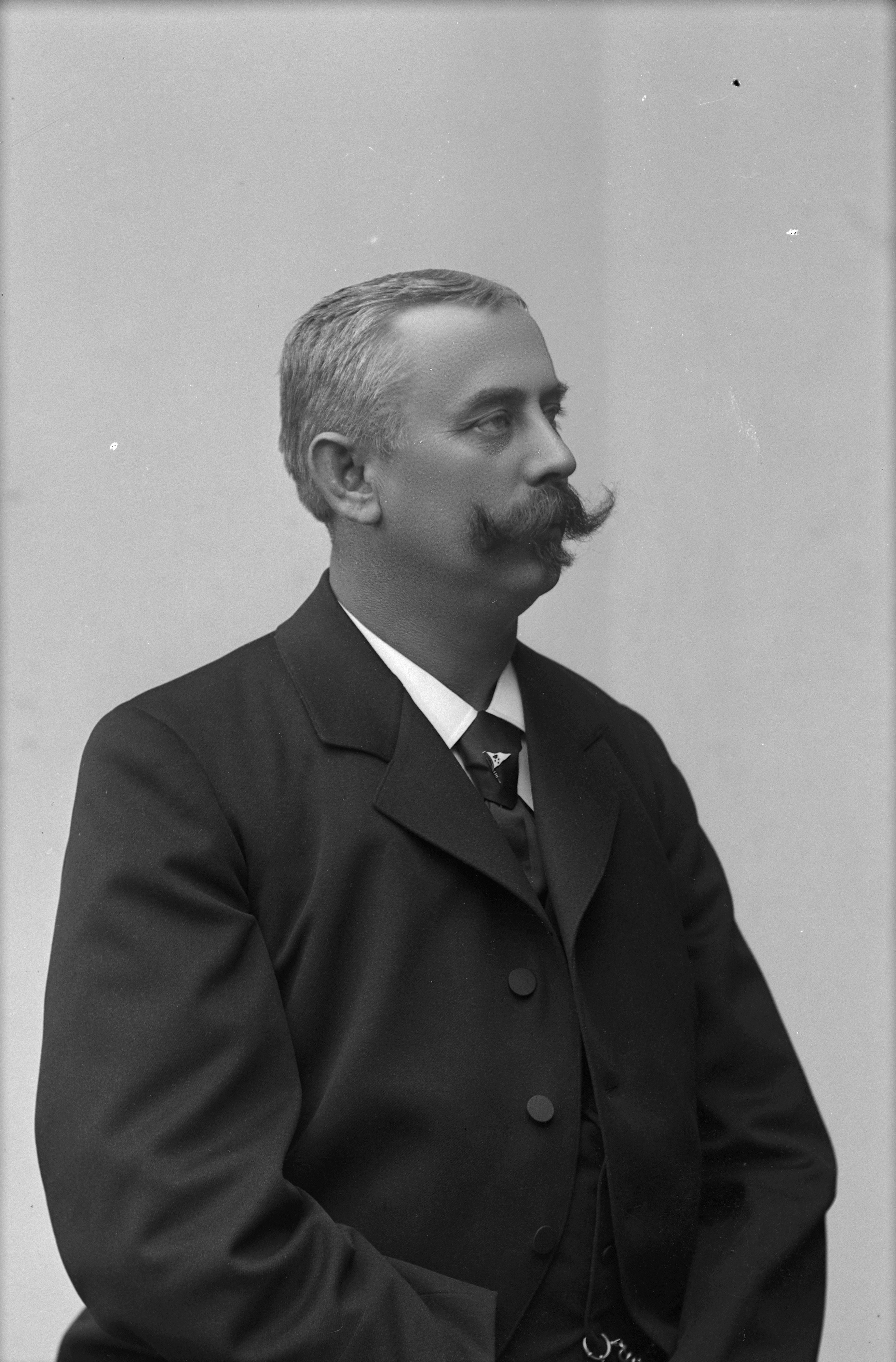 Porträtt i halvfigur av kemiingenjör Eskil Metzén, innehavare av Metzéns Kemtvätt.