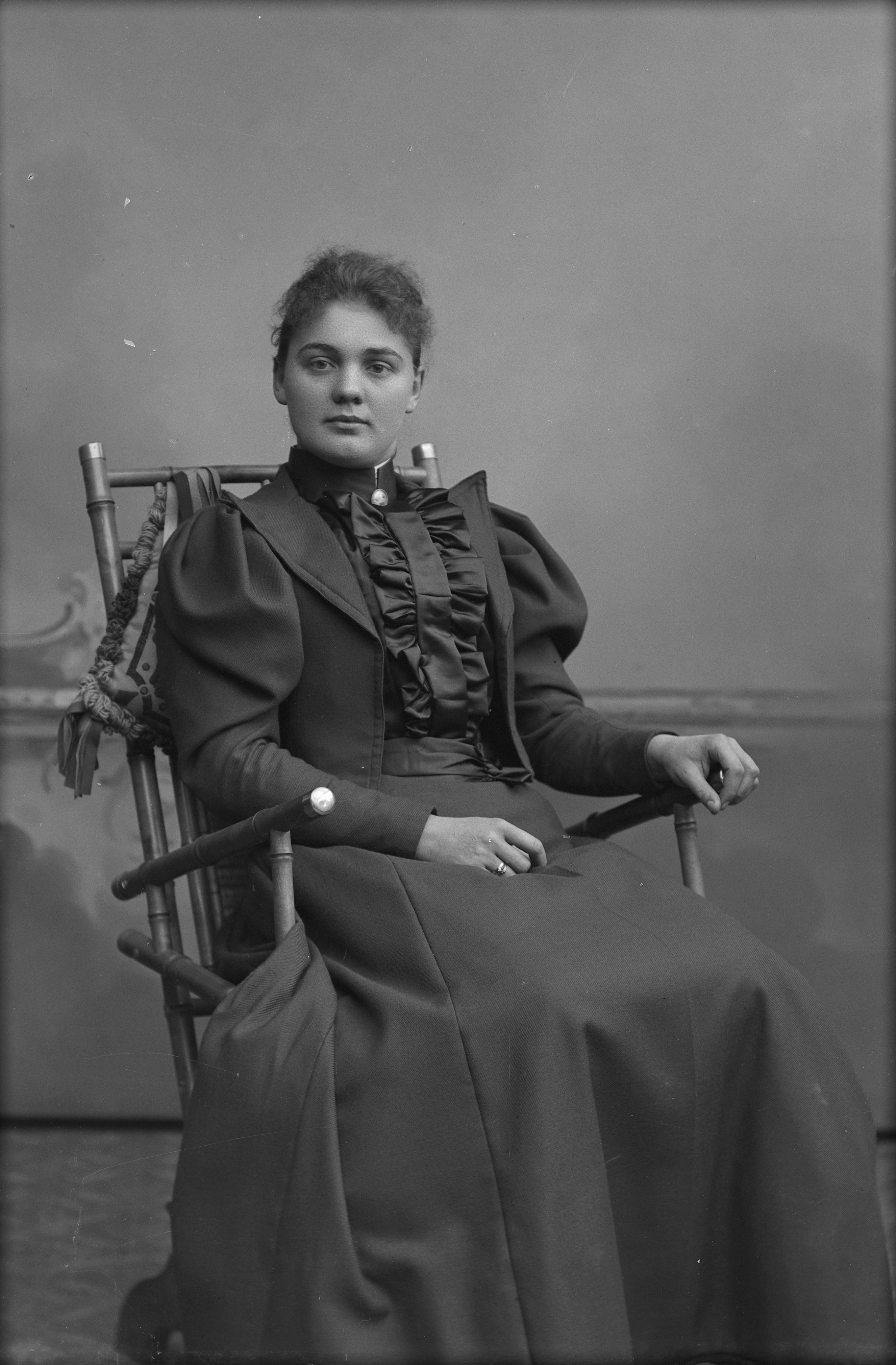Porträtt i helfigur av fröken Holmquist, sittande i stol.