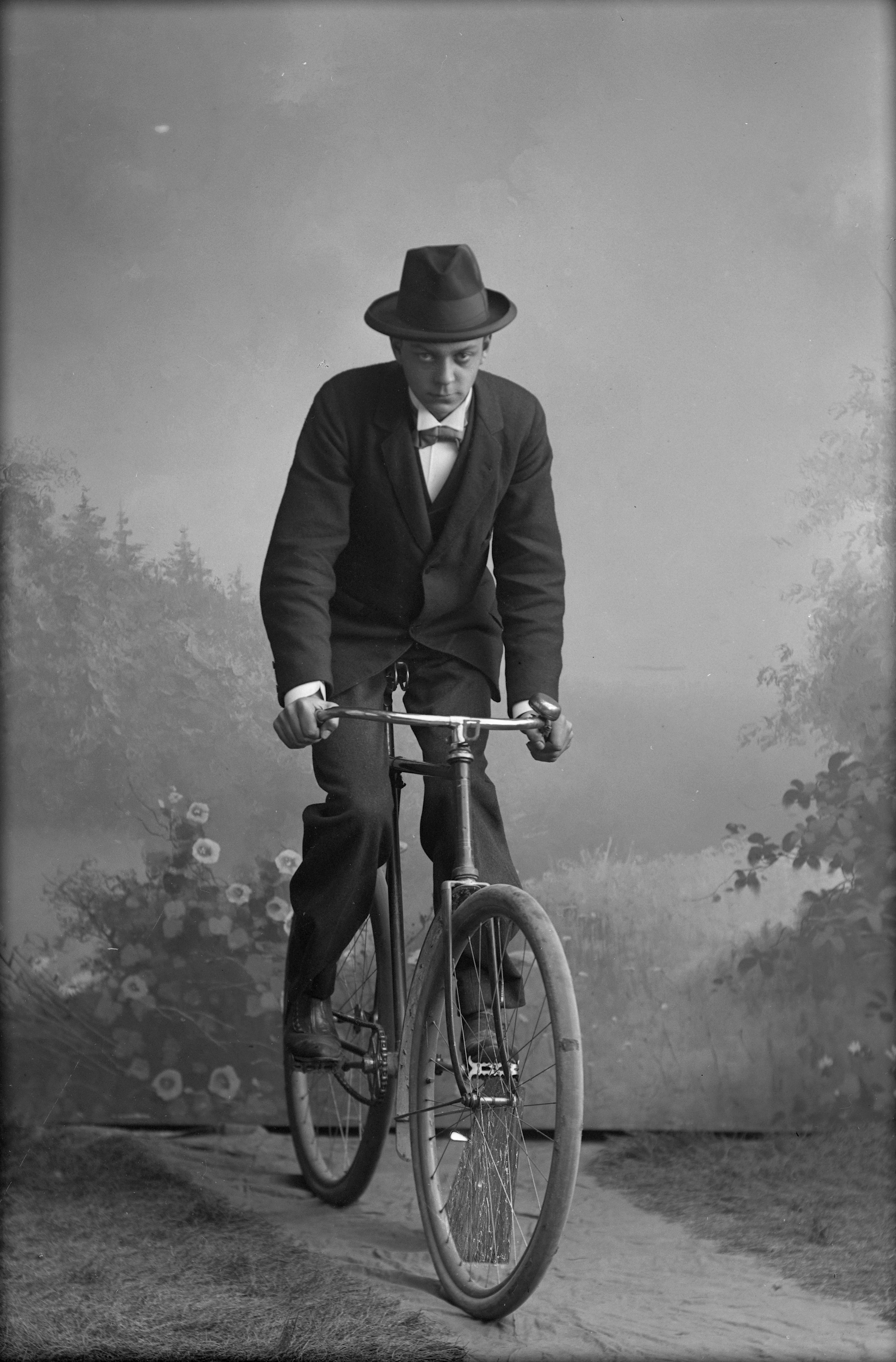Porträtt i helfigur av herr Ståhl, iklädd hatt, sittande på cykel. Fotograferad framför ateljéfond med skogsmotiv.