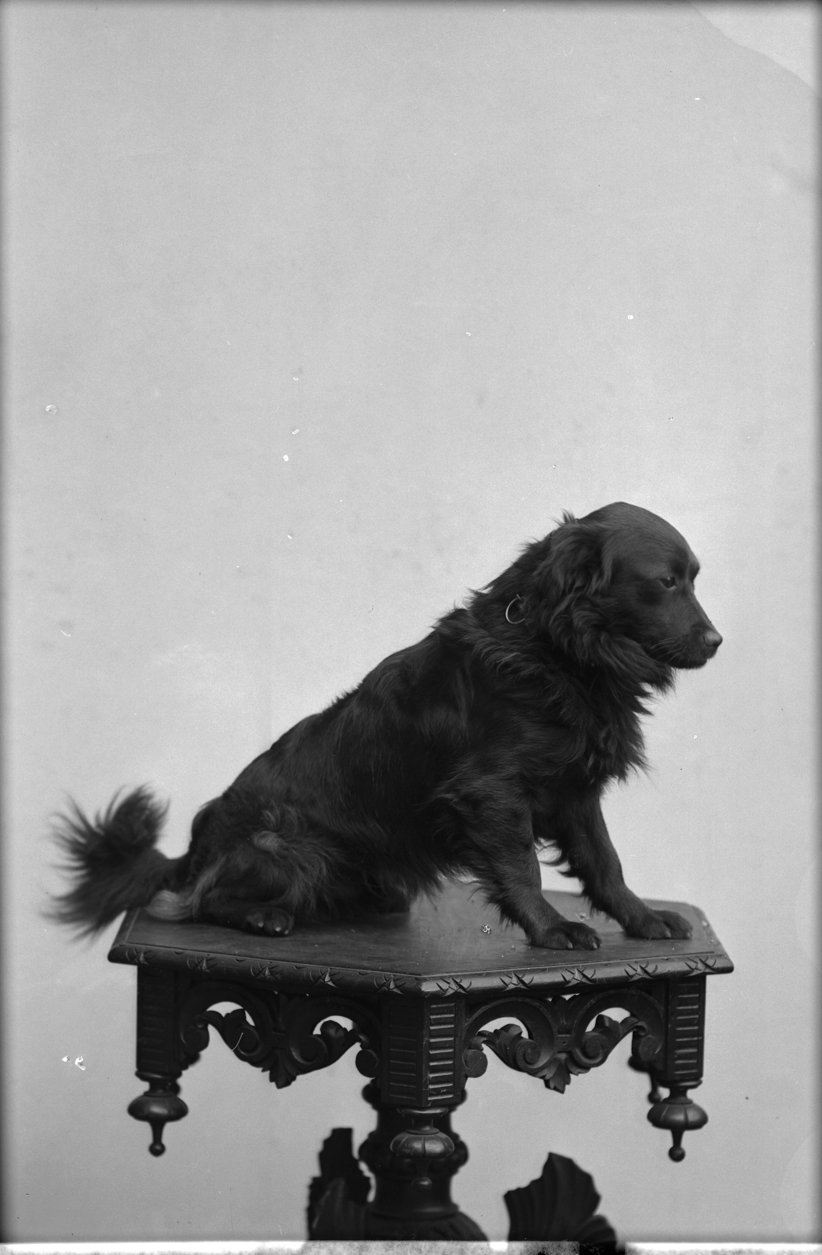 Beskrivning: Porträtt av Agda Nilssons hund, sittande på bord.