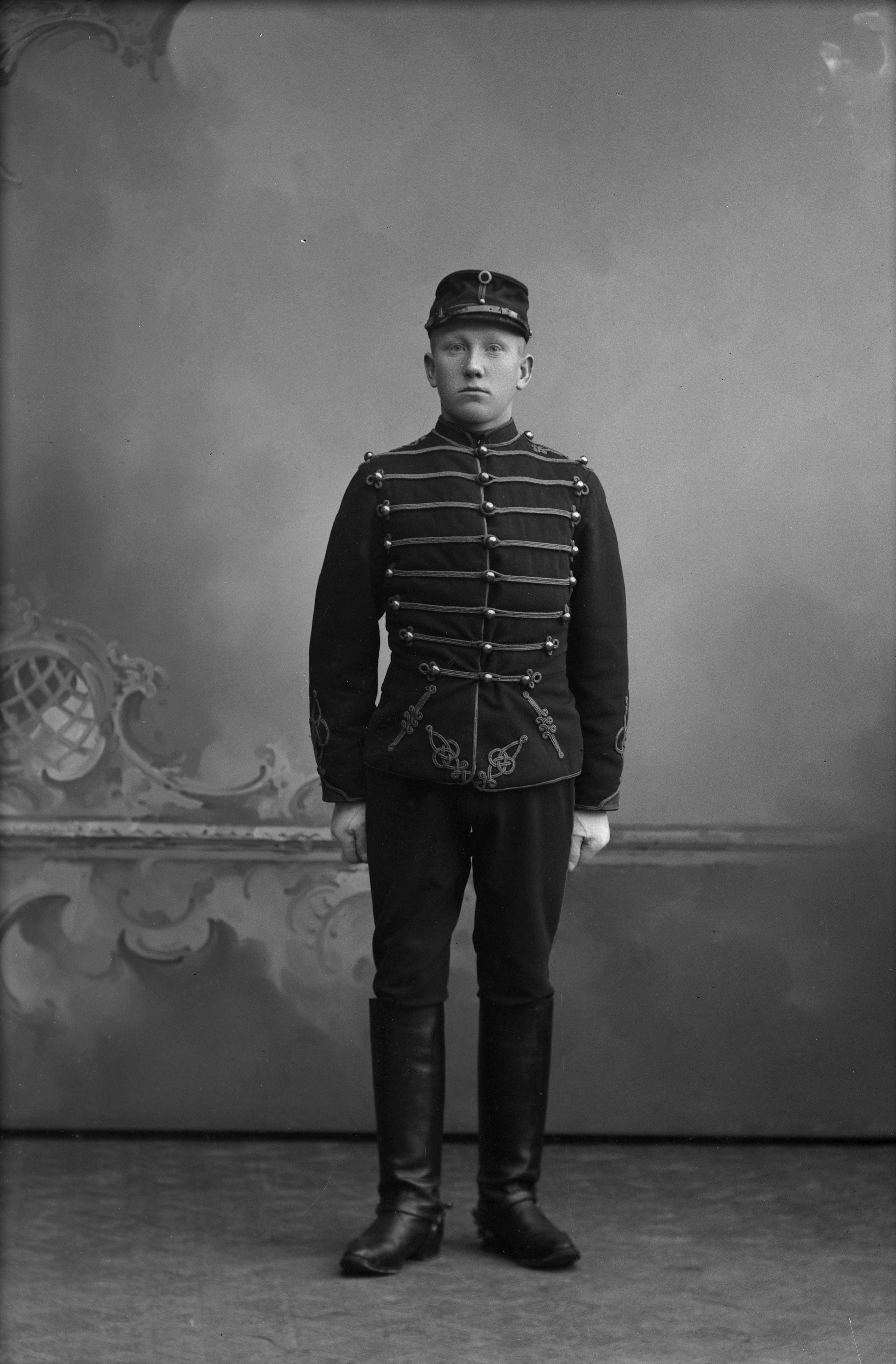Porträtt i helfigur av husar Vahlstedt, iklädd militäruniform och - mössa.