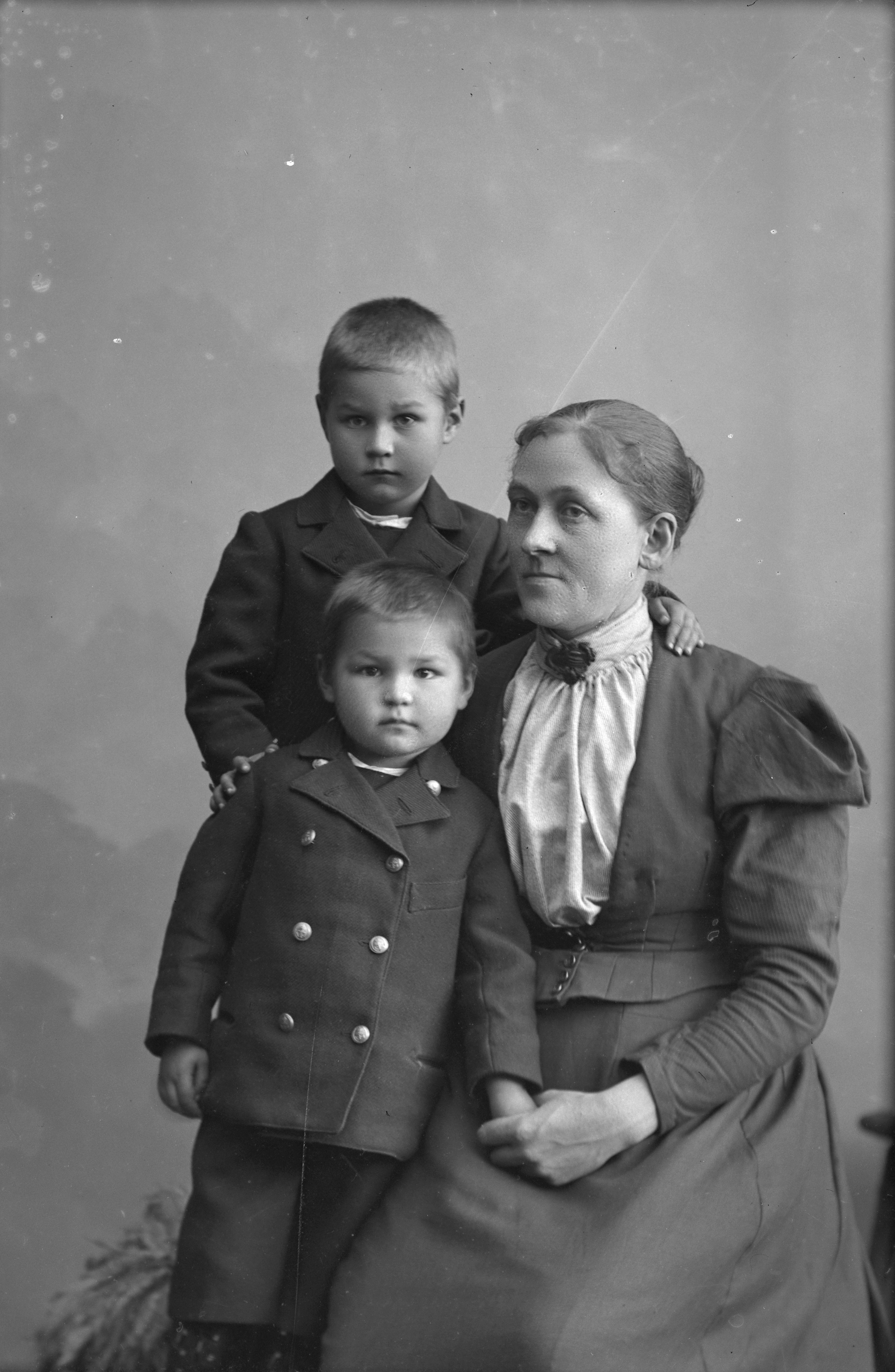 Beskrivning: Porträtt i helfigur av Hulda Lifström med två okända pojkar.