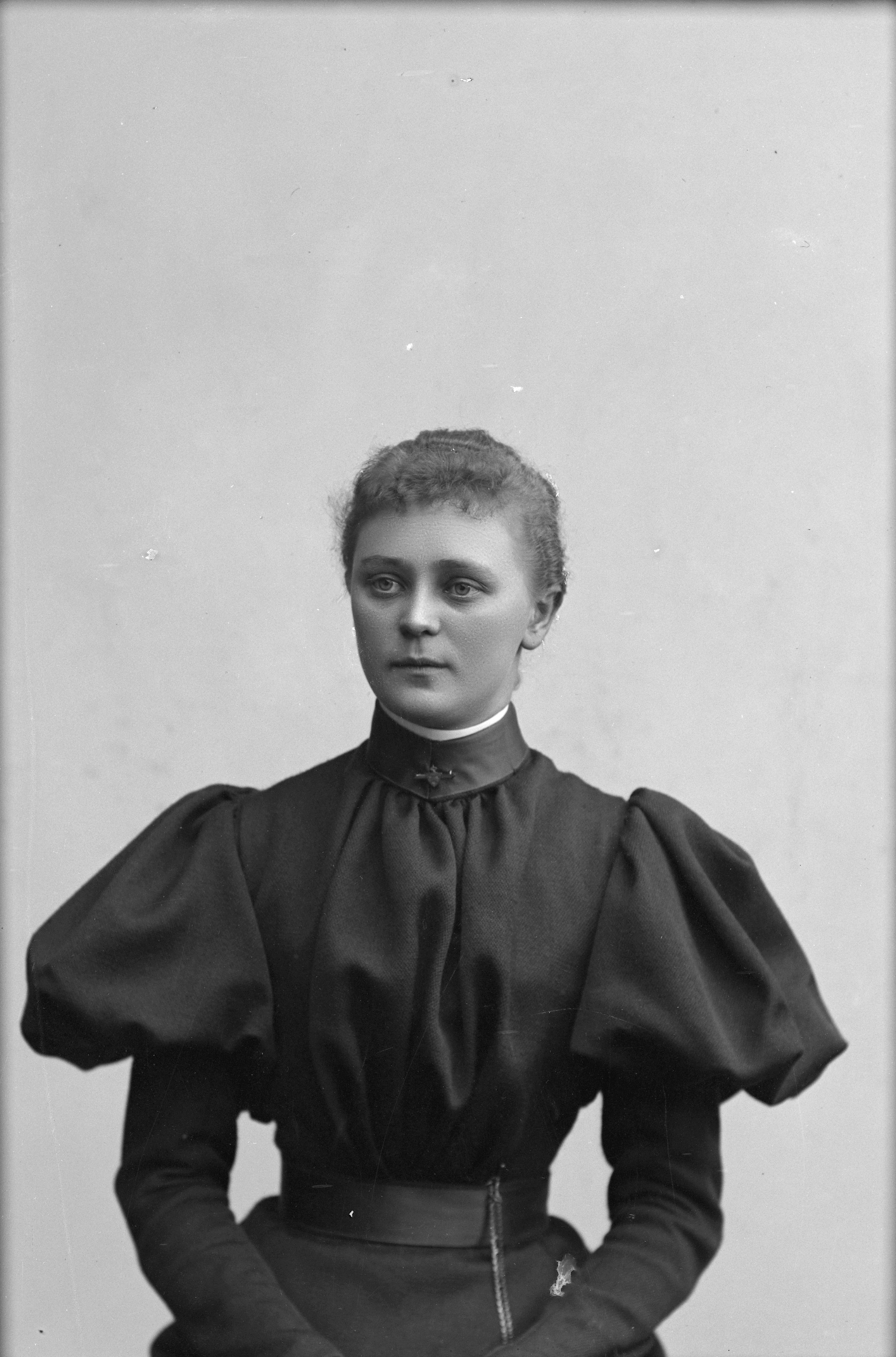 Beskrivning: Porträtt i halvfigur av Hilma Ekdahl vid J. G. Hedbergs Bokhandel.