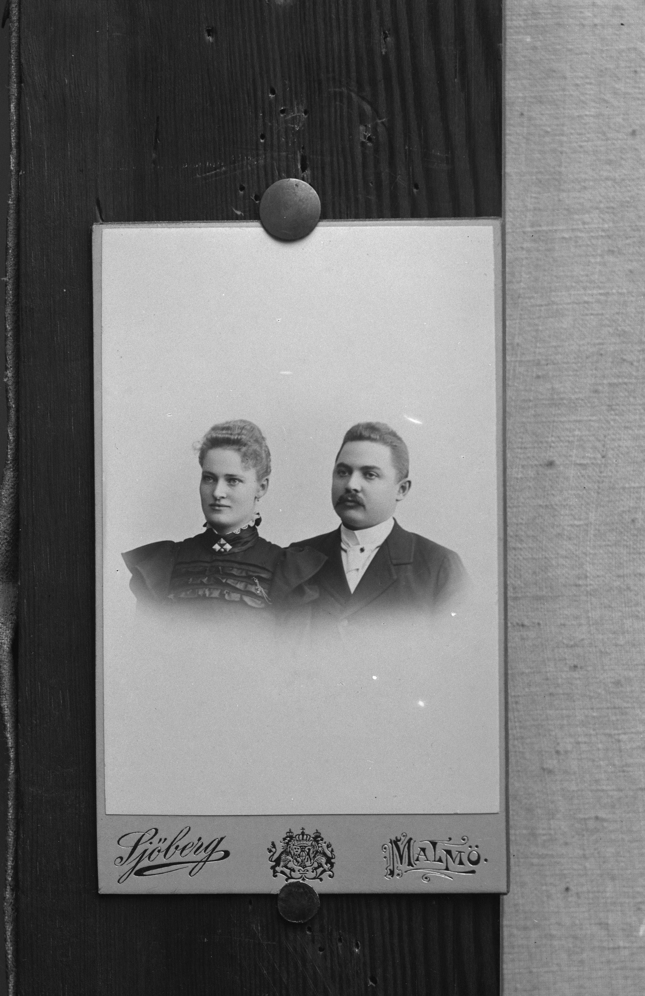 Porträtt i halvfigur av J. Dunér med fru. Visitkort med ateljélogotyp, "Sjöberg /Malmö".
