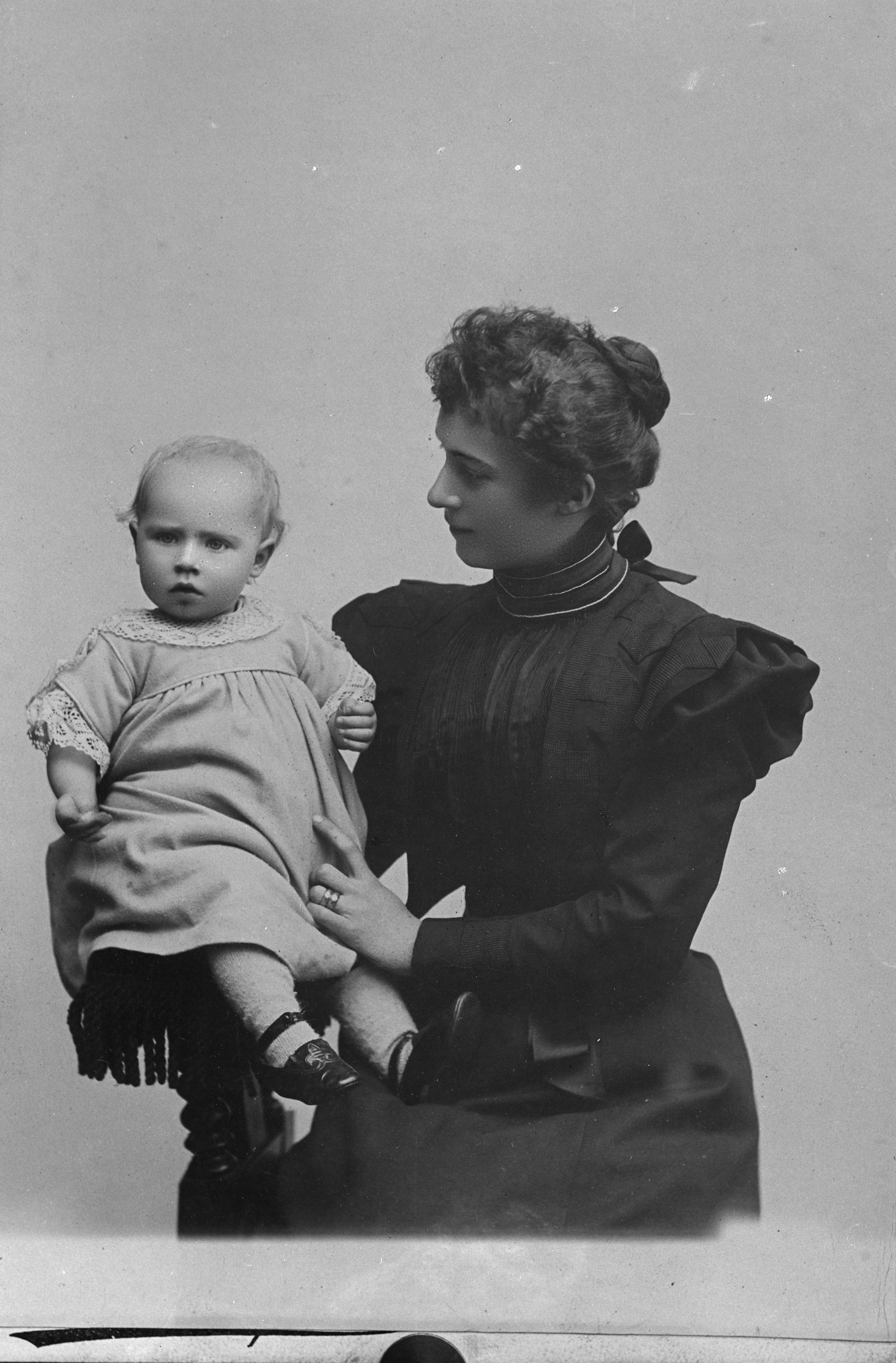 Beskrivning: Porträtt i halvfigur av fru Stave, hållande sitt barn i famnen. Barnet i helfigur.