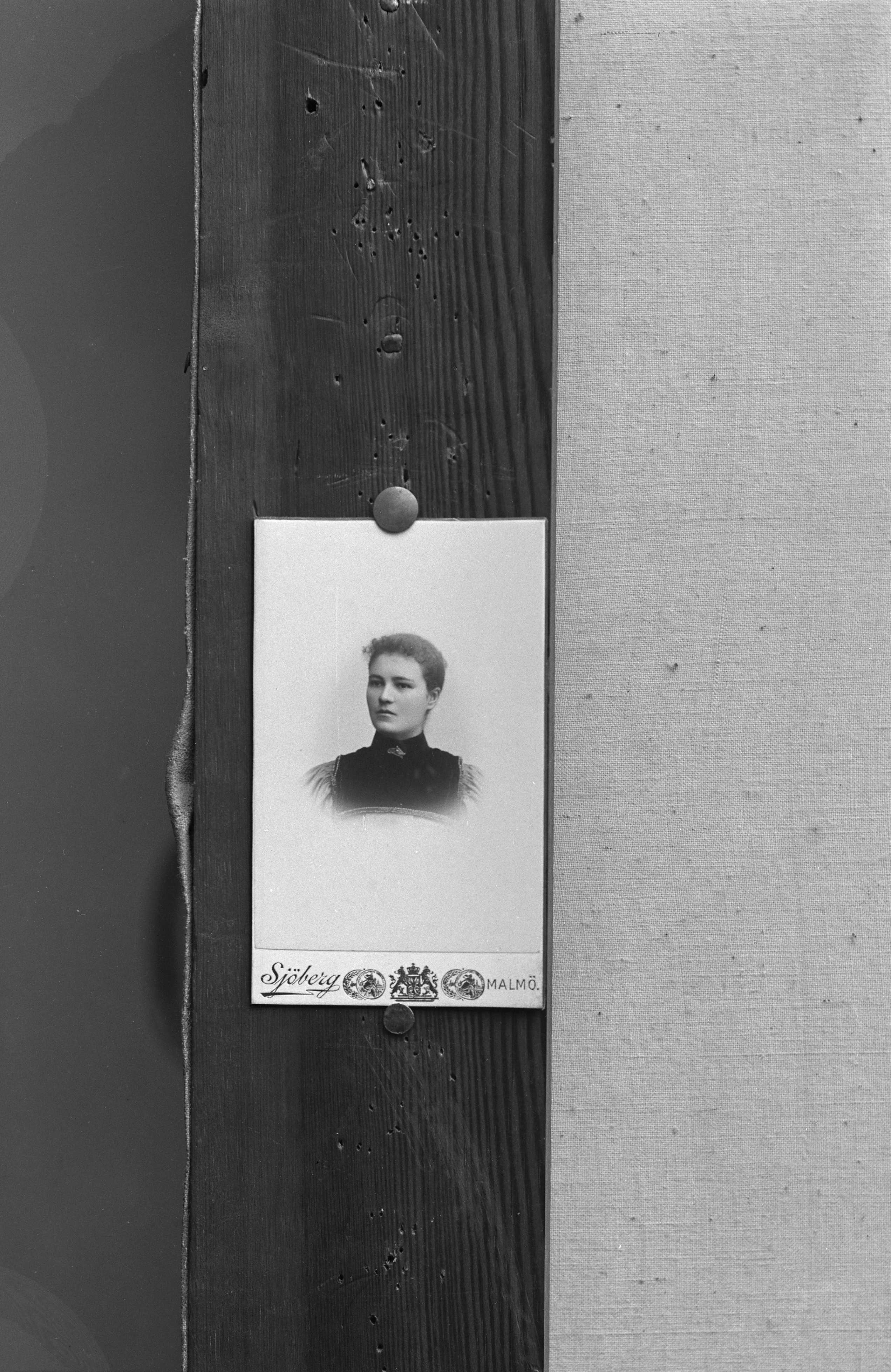 Porträtt i halvfigur av fru Nilsson. Visitkort med ateljélogotyp, "Sjöberg /Malmö".