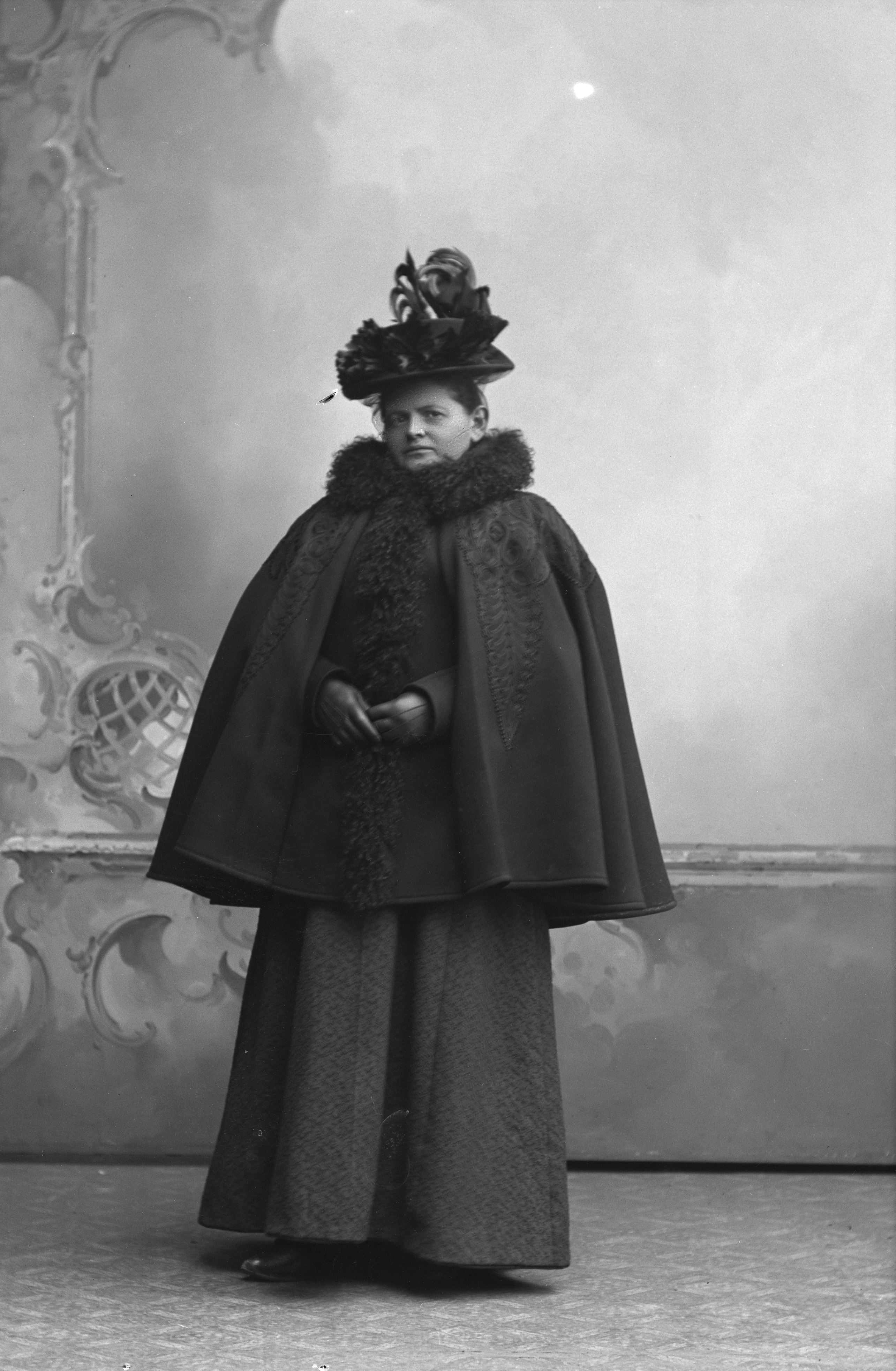 Porträtt i helfigur av Agnes Henning, iklädd hatt med fjäder och midjelång cape med päls runt halsen.