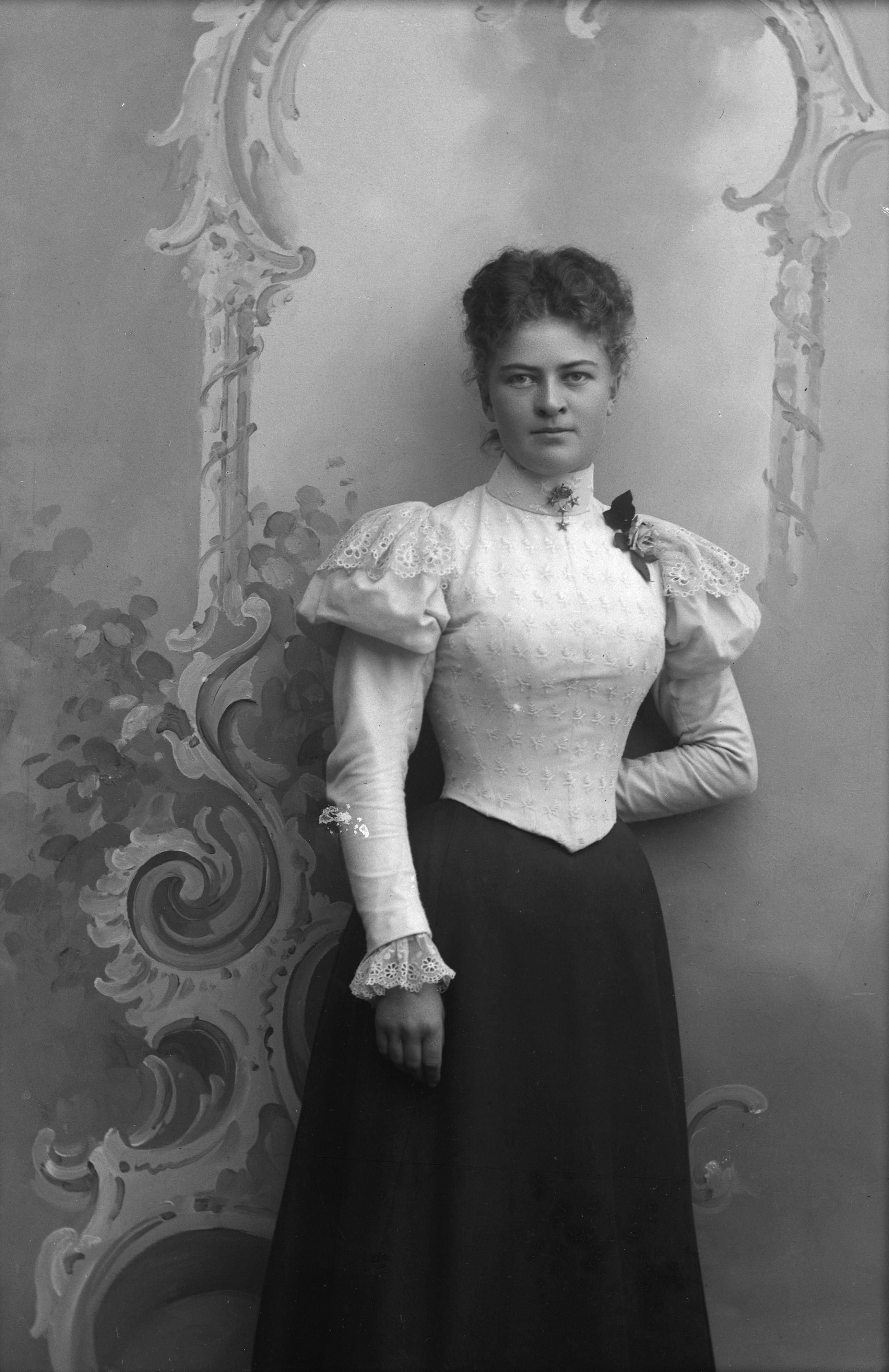 Porträtt i helfigur av Ragnhild Landgren, klädsömmerska, fotograferad framför ateljéfond.
