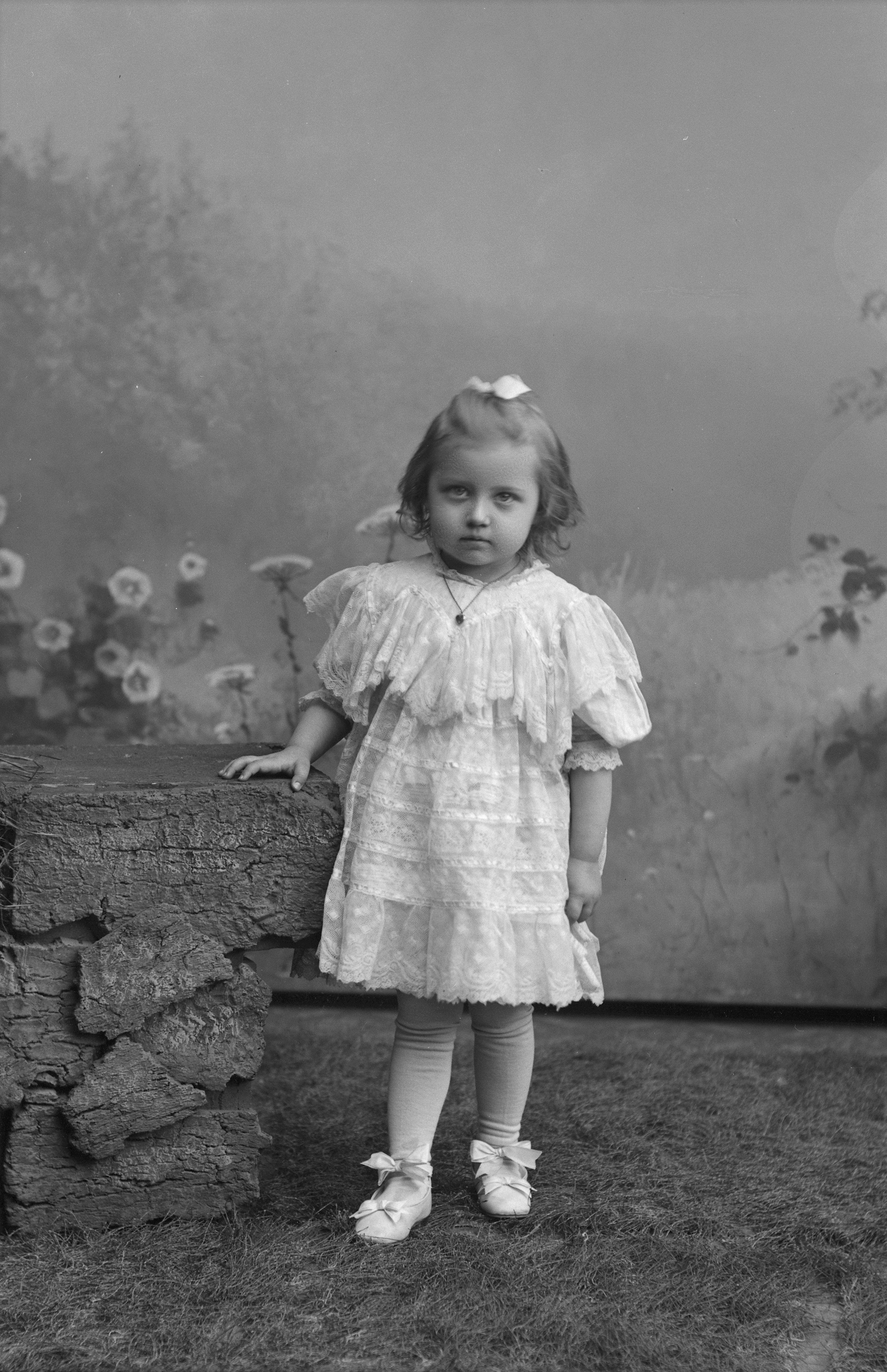 Porträtt i helfigur av Kramers dotter, med rosett i håret, stående vid tegelmur. Fotograferad framför ateljéfond med skogs- och blomstermotiv.