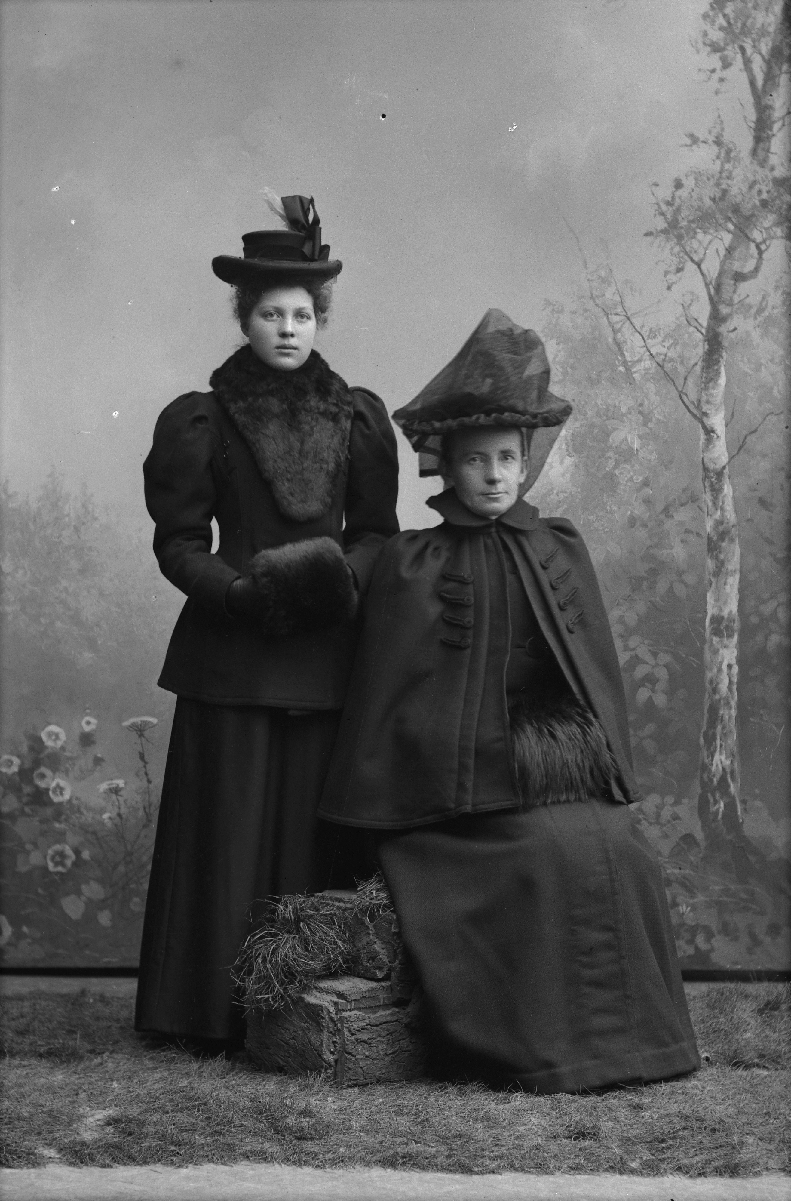 Porträtt i helfigur av Hanna Pålsson med okänd kvinna, iklädda hattar och kappor, båda hållande handmuffar i päls. Hanna Pålsson sittande på tegelmur. Fotograferade framför ateljéfond med skogs- och blomstermotiv.
