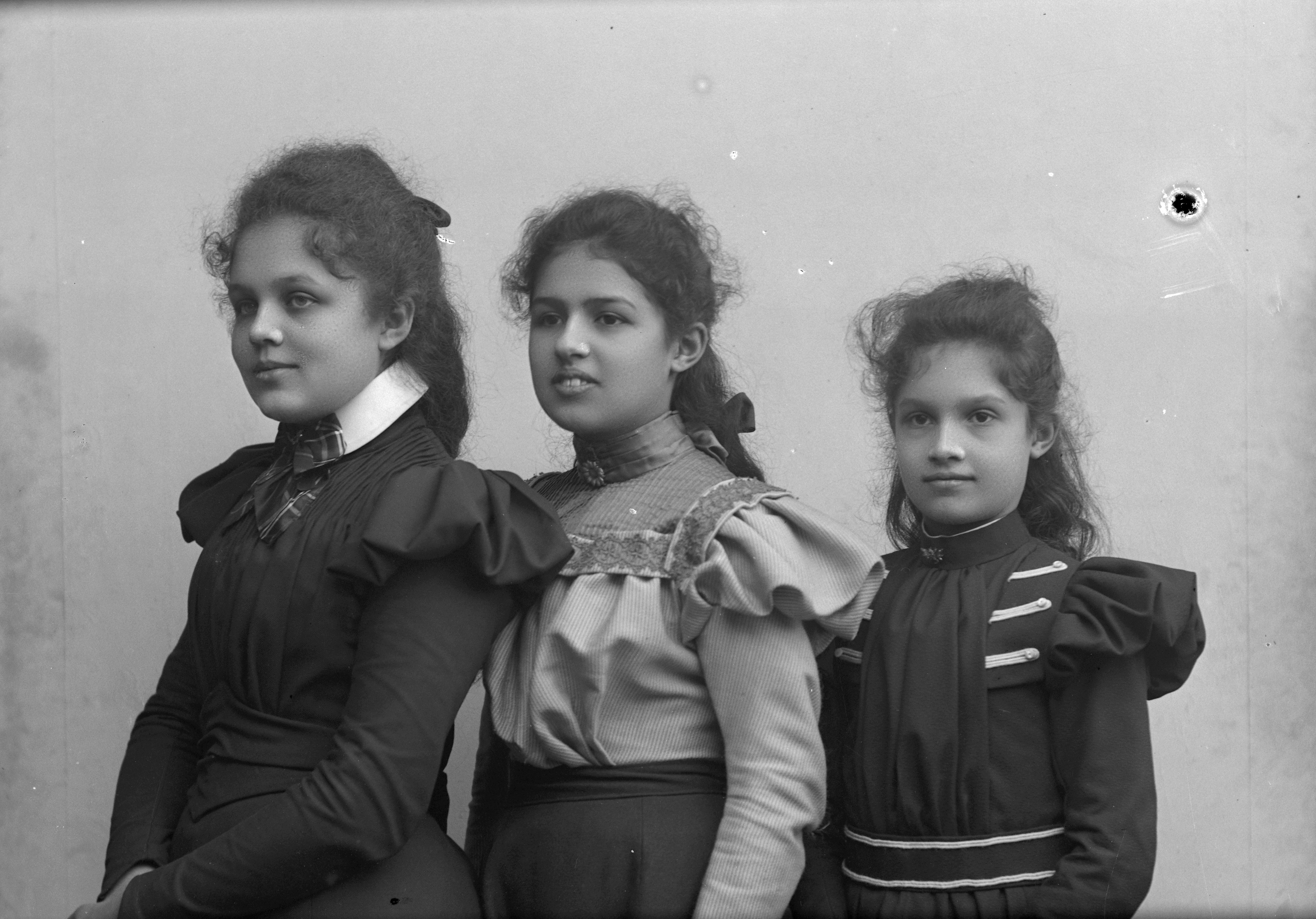 Porträtt i halvfigur av A. Fischer med två okända kvinnor, stående på rad, bakom varandra.