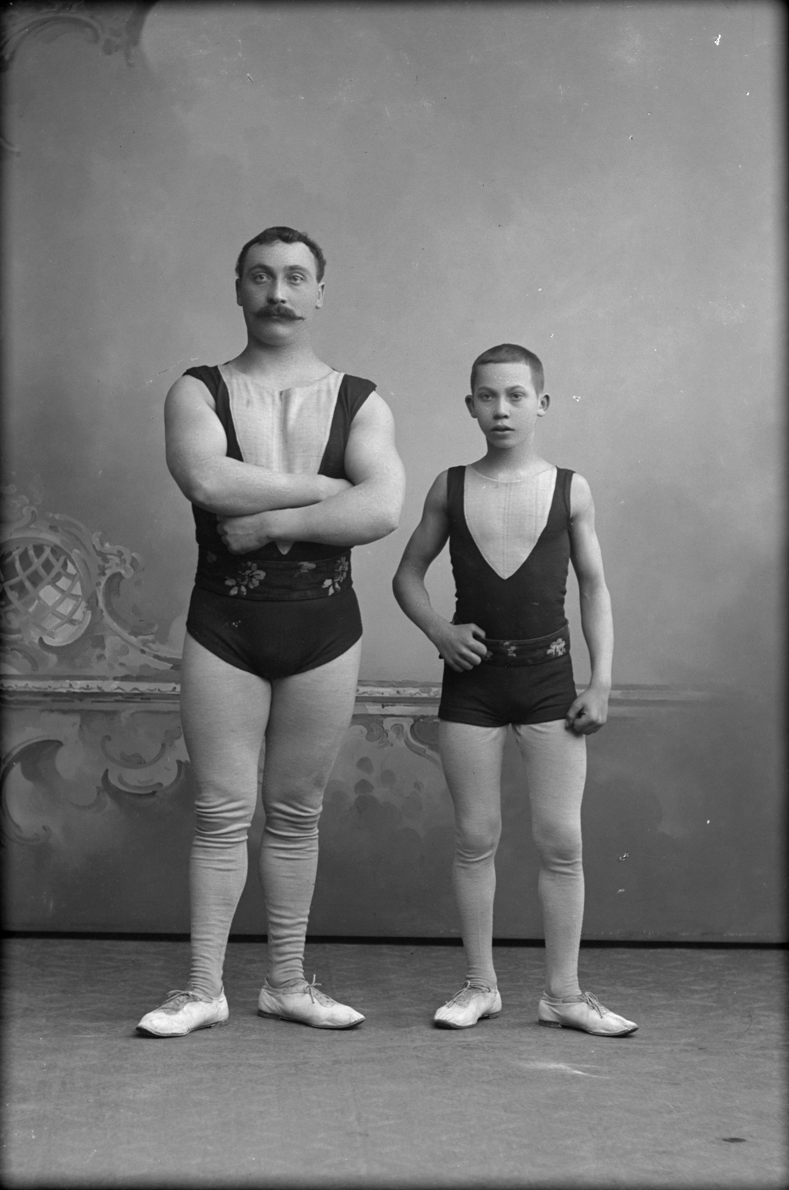 Porträtt i helfigur av A. Sjöholm med son, iklädda gymnastikdräkter.