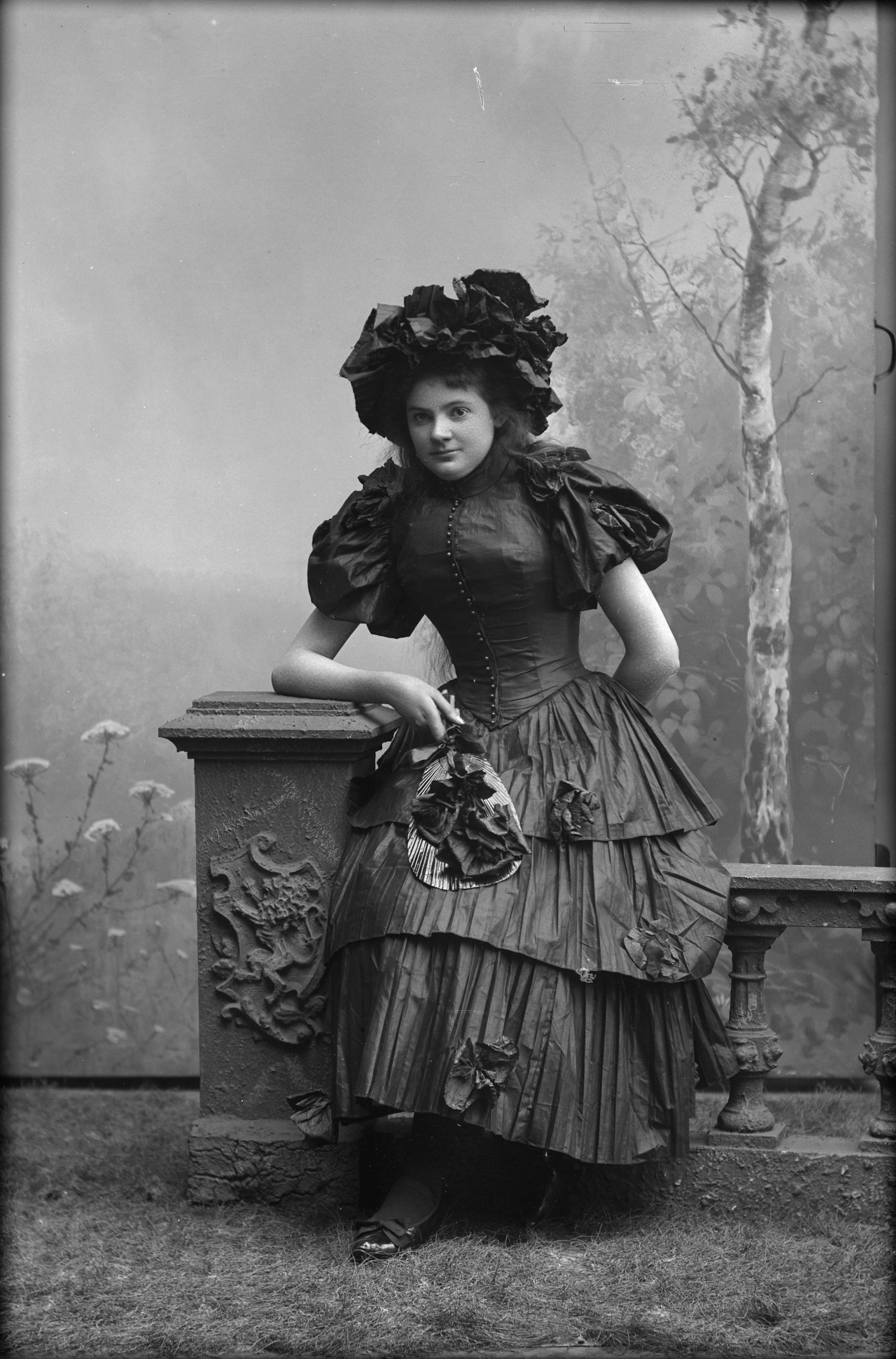 Porträtt i helfigur av fröken Olsson, iklädd hatt, sittande på stenstaket med balustrad, hållande portmonnä. Fotograferand framför ateljéfond med skogs- och blomstemotiv.