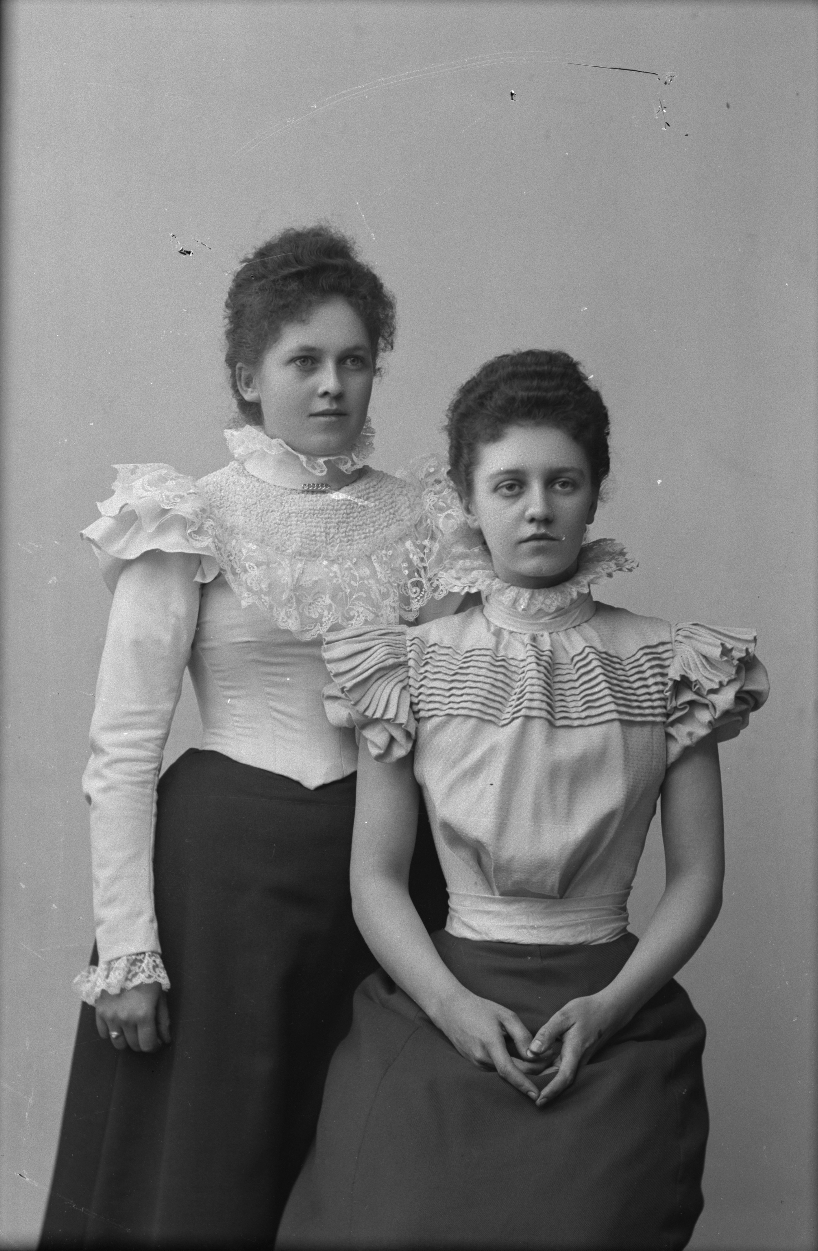 Porträtt i halvfigur av Hulda Jönsson, vid skrädderifirman Palmqvist & Jönsson, med okänd kvinna. En av kvinnorna sittande.