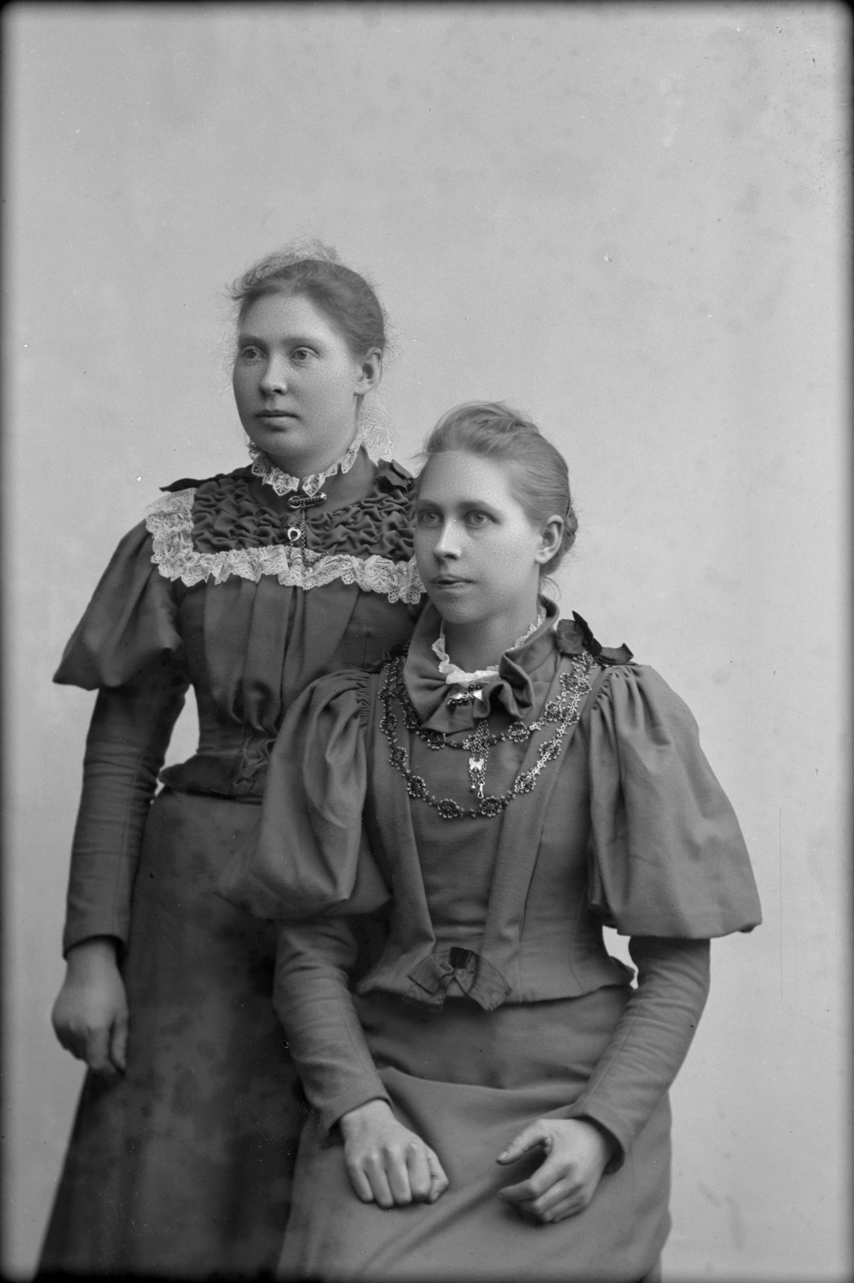 Beskrivning: Porträtt i helfigur av Anna Holmberg med okänd kvinna.