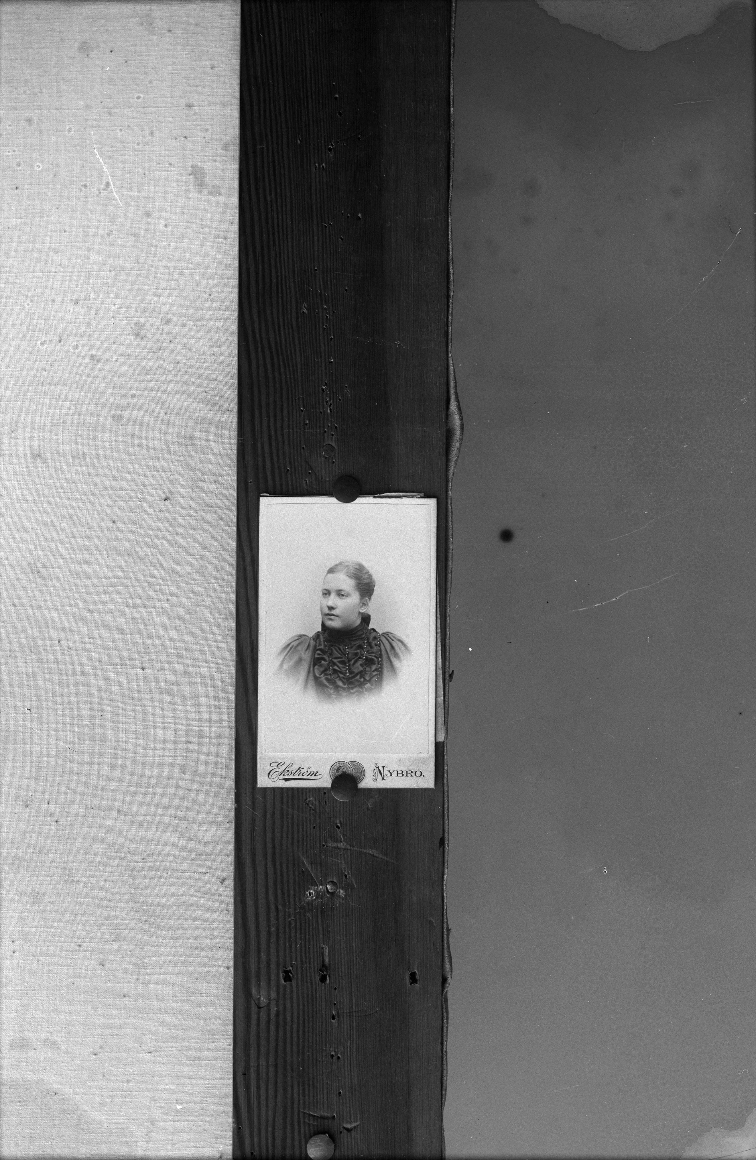 Porträtt i halvfigur av oidentifierad kvinna, möjligen A. Malmgrens fru. Visitkort med ateljélogotyp, "Ekström /Nybro".