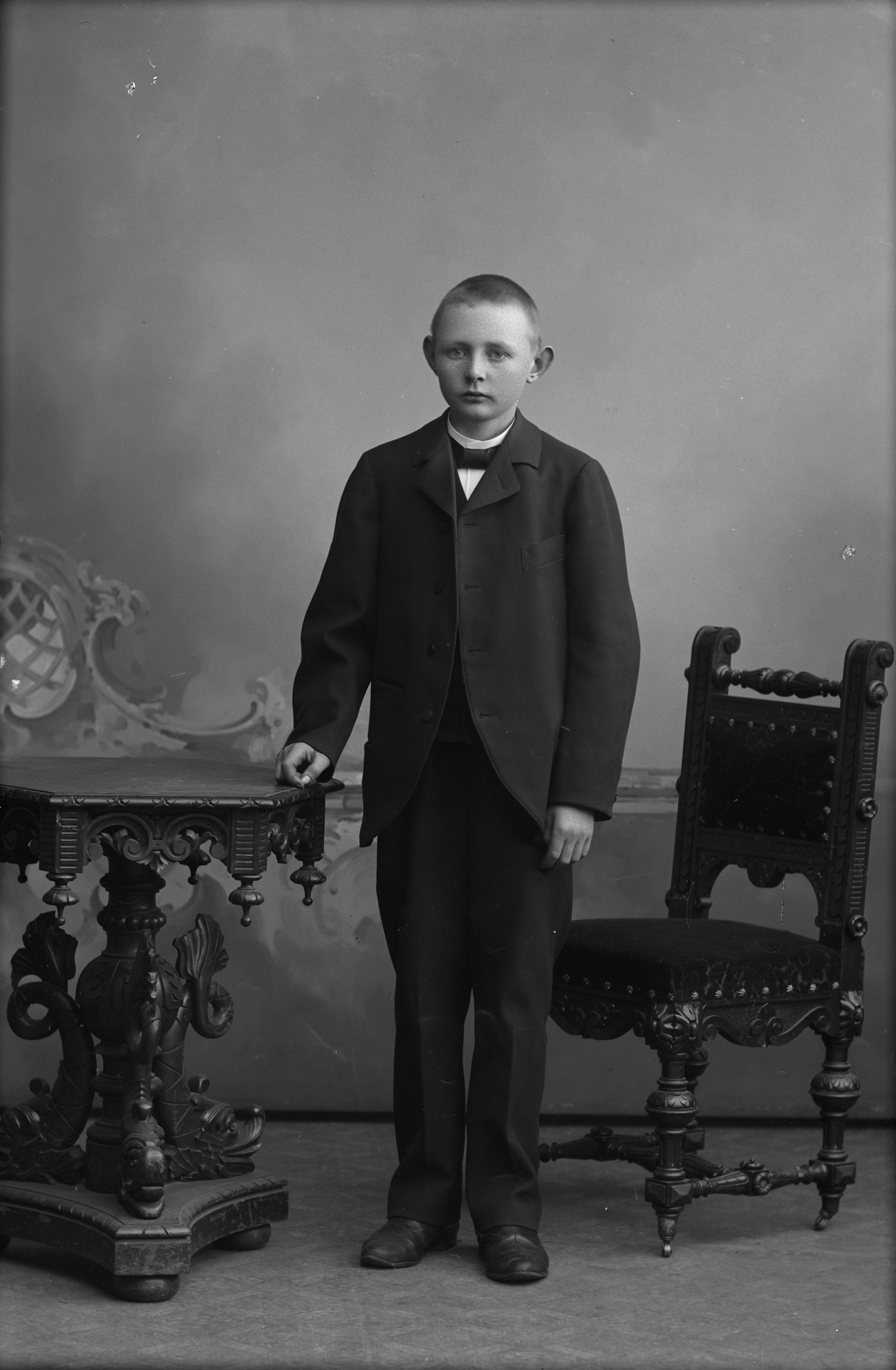 Porträtt i helfigur av Albin Wittgren, stående mellan stol och bord.