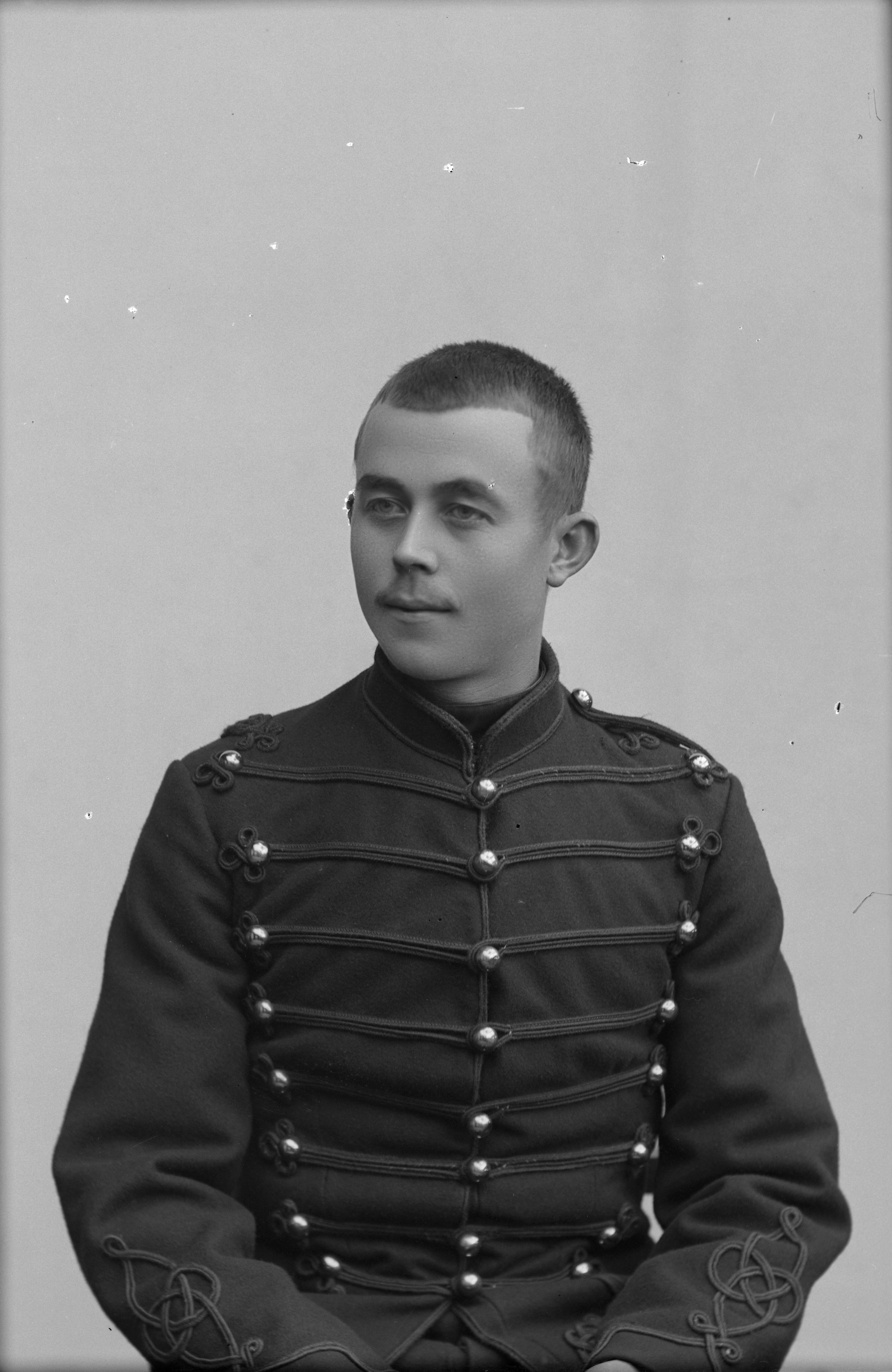 Porträtt i halvfigur av husar Lindsjö, iklädd militäruniform.