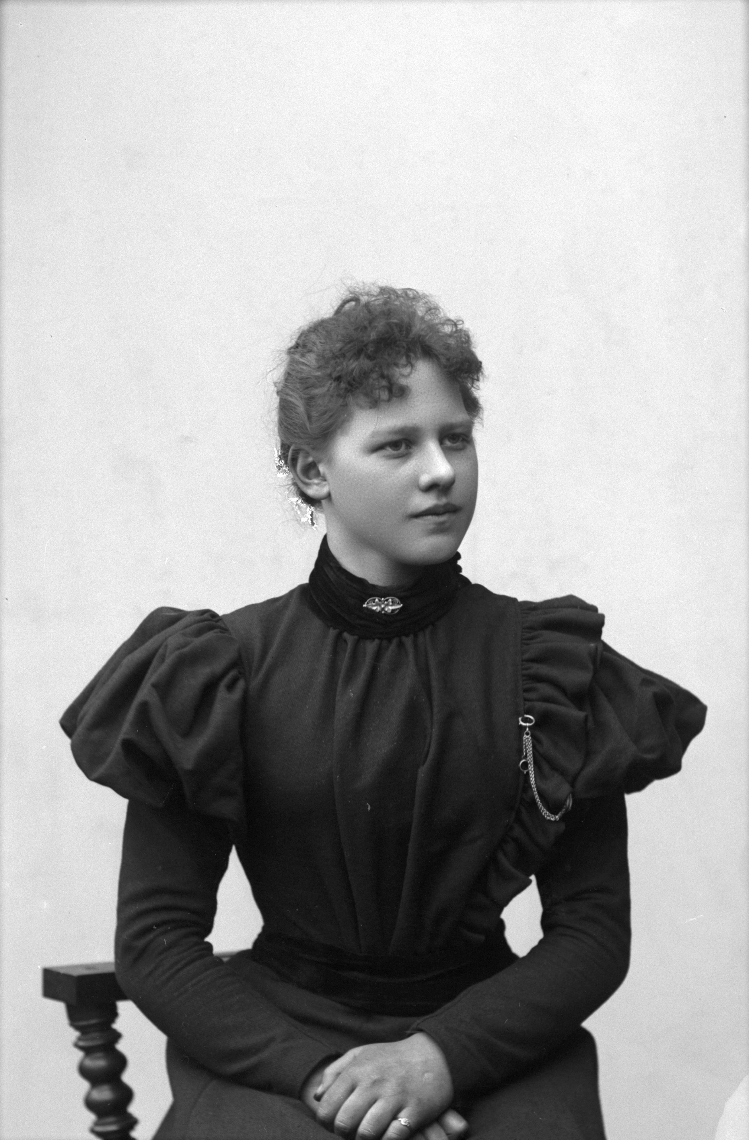 Porträtt i halvfigur av Hulda Jönsson vid skrädderifirman Palmqvist & Jönsson, sittande i stol.