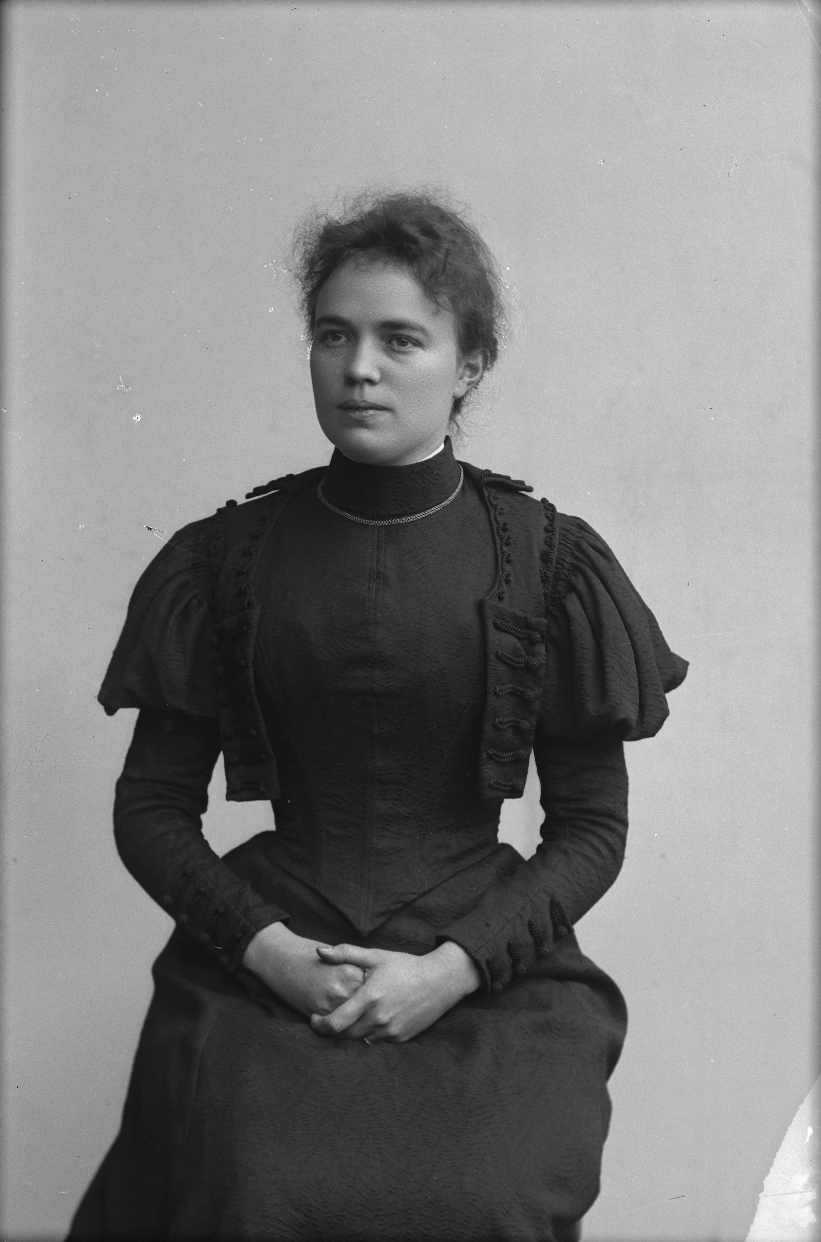 Beskrivning: Porträtt i helfigur av fröken Hansson.