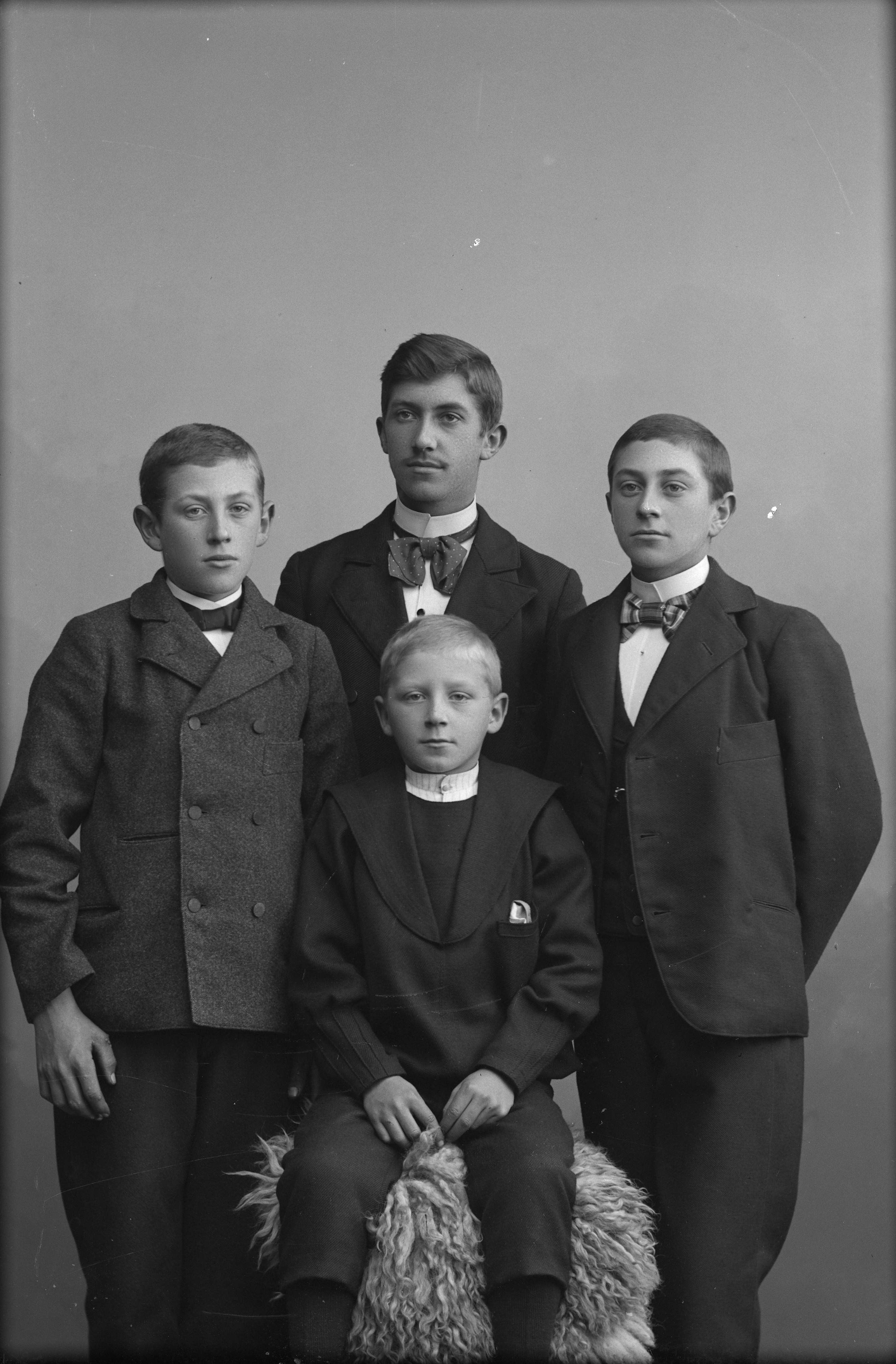 Porträtt i helfigur av Oscar Janson med okänt sällskap, två andra män och en pojke.
