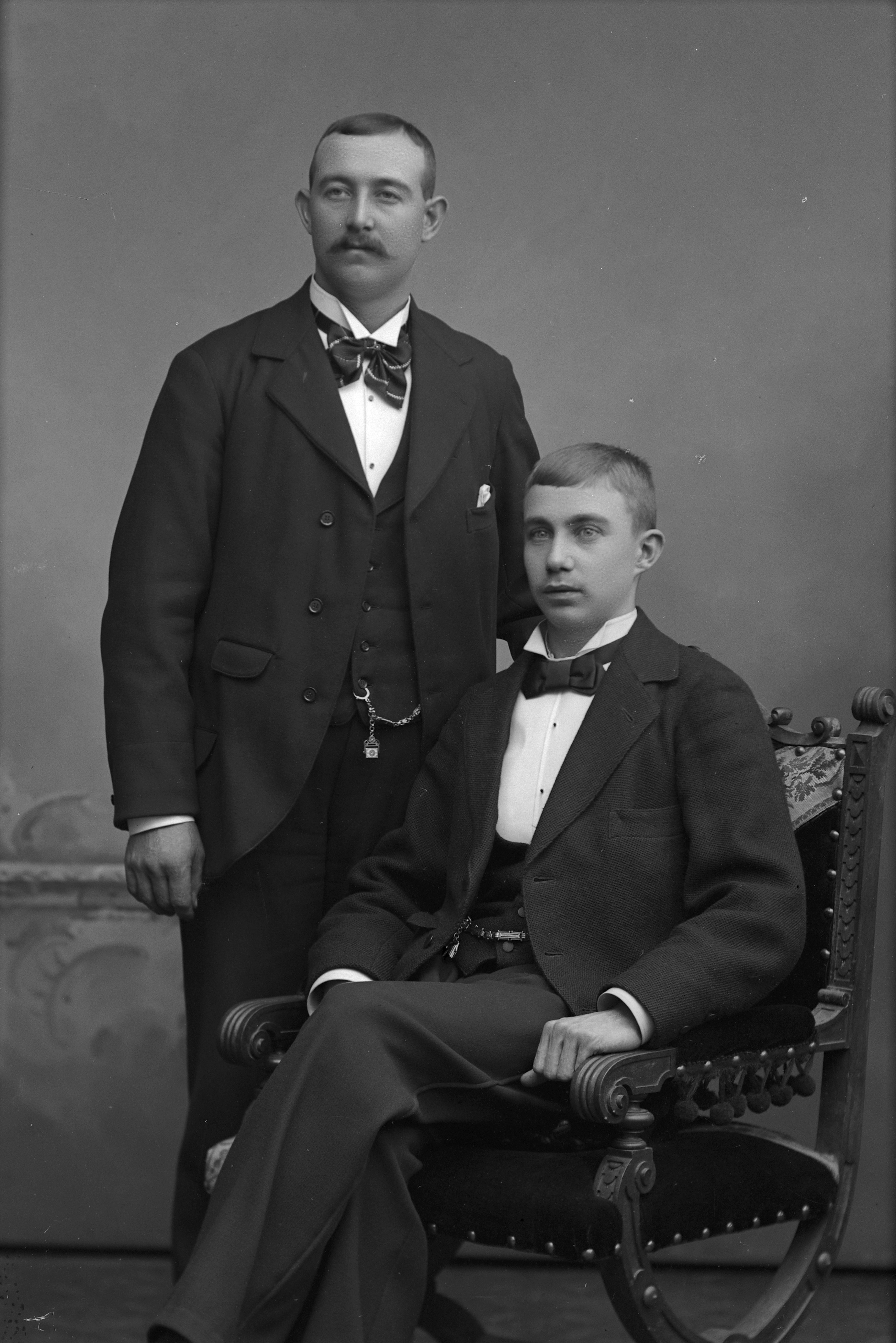 Porträtt i helfigur av K. Kjellberg, sittande i stol, och Josef Cronberg.