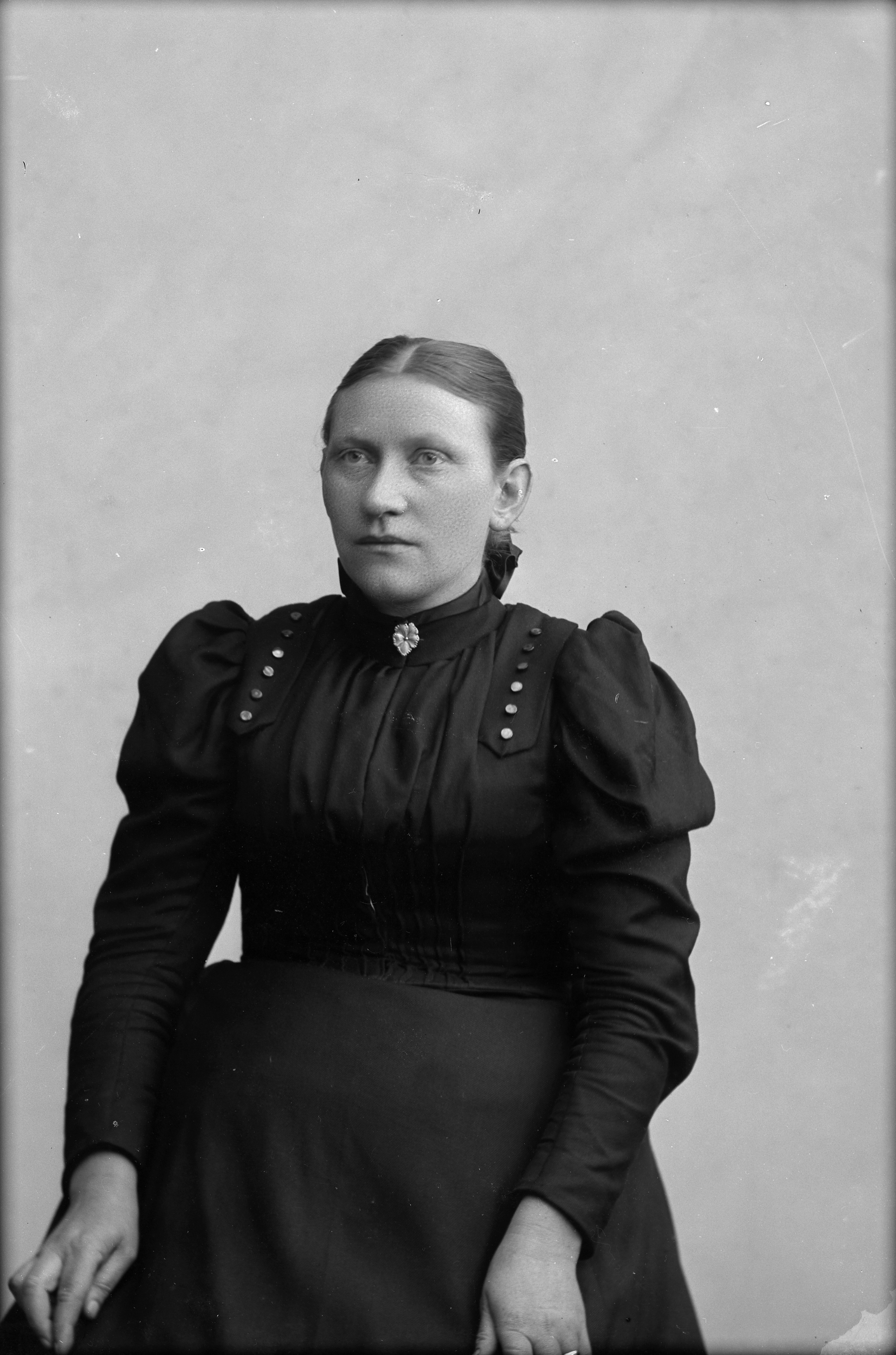 Beskrivning: Porträtt i halvfigur av fru Johansson /Monbijougaran.