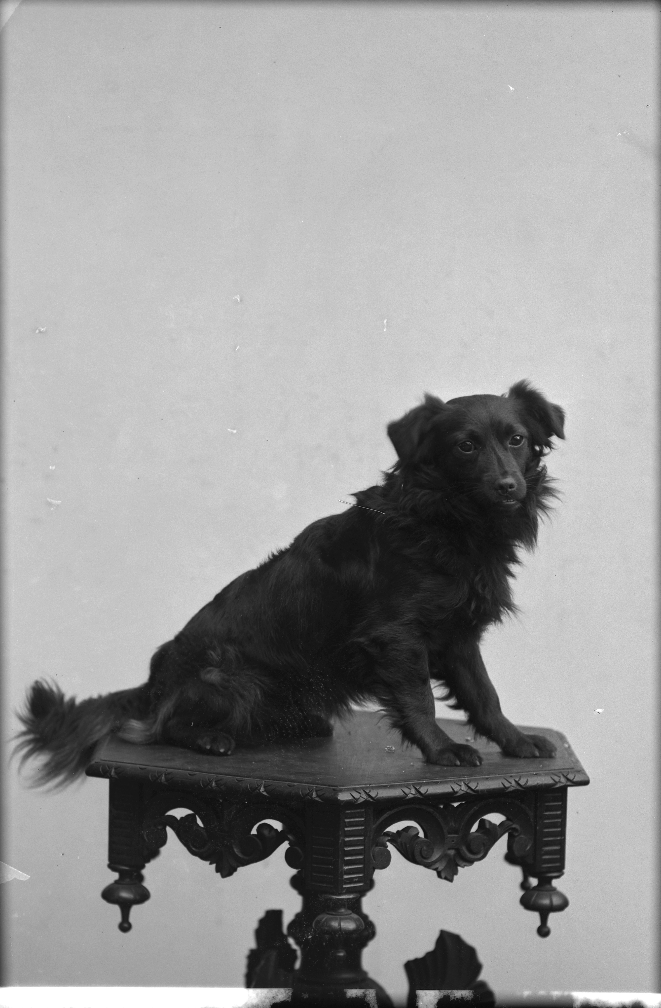 Porträtt av Agda Nilssons hund, sittande på bord.