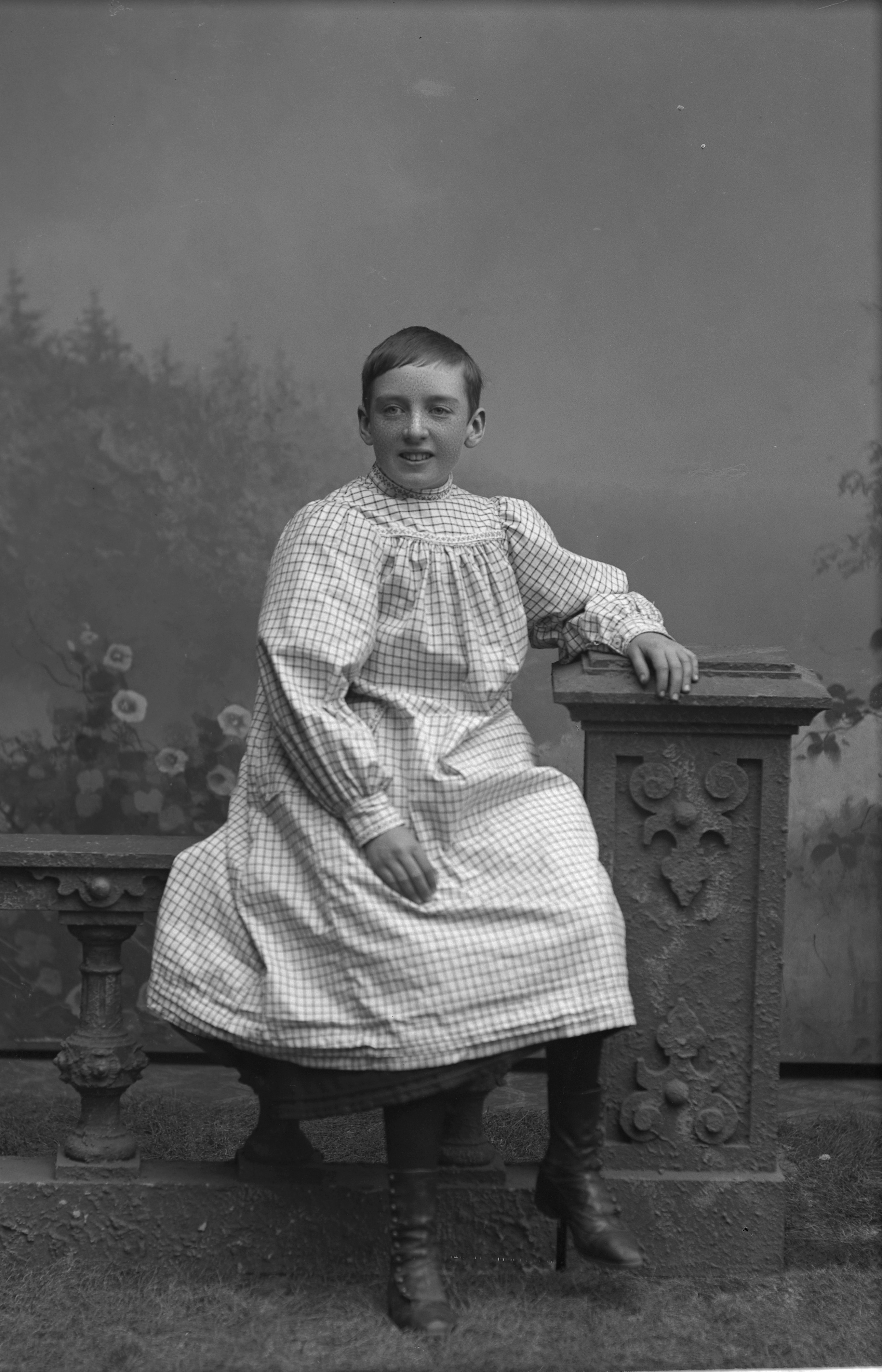 Porträtt i helfigur av Ellen Augusta Maria eller Helga Schweder, sittande på stenstaket. Fotograferad framför ateljéfond med skogsmotiv.