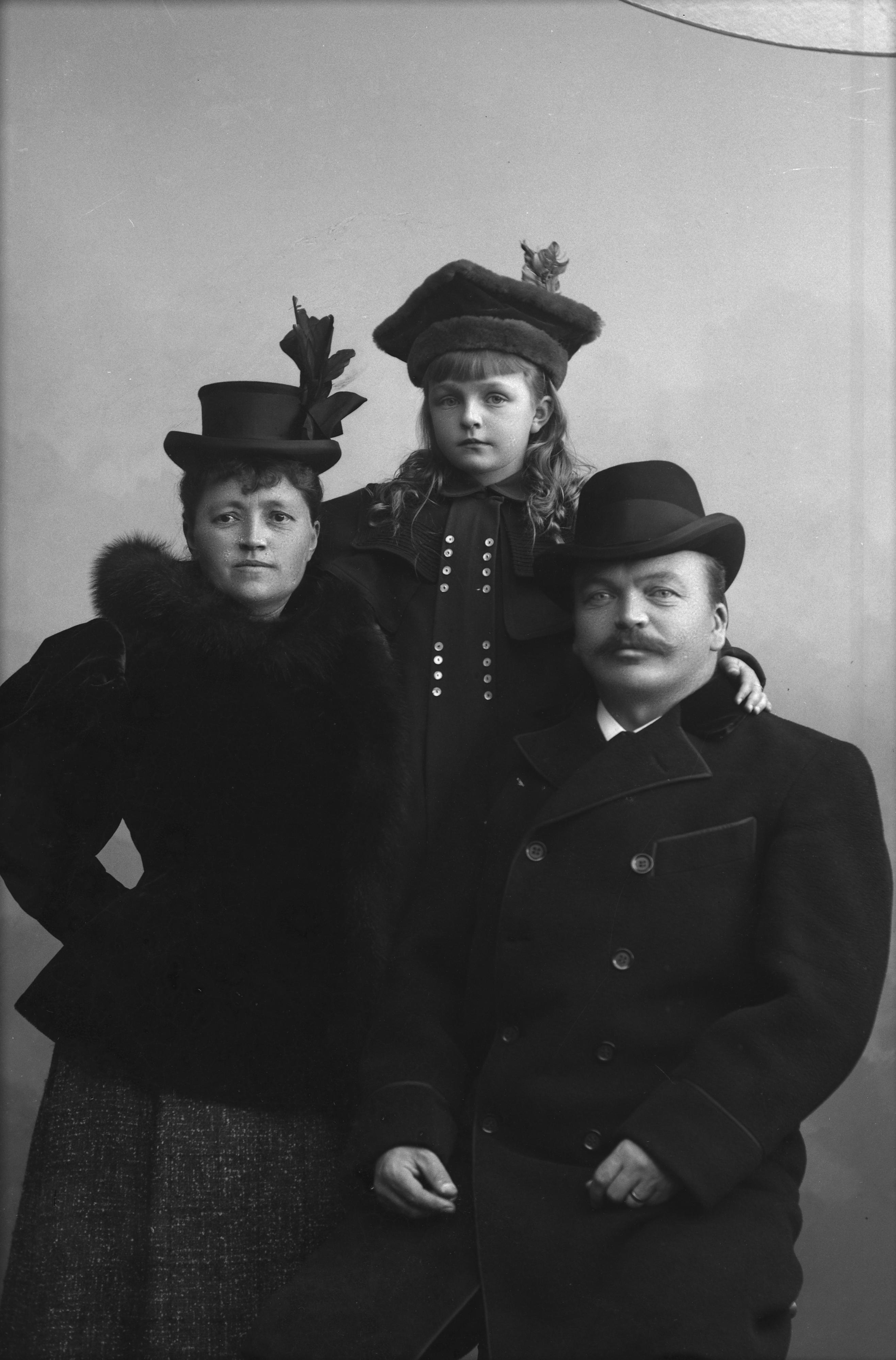 Porträtt i helfigur av ingenjör Möller med fru och dotter. Frun och dottern iklädda damhatt och -kappa, herr Möller i rock och plommonstop.