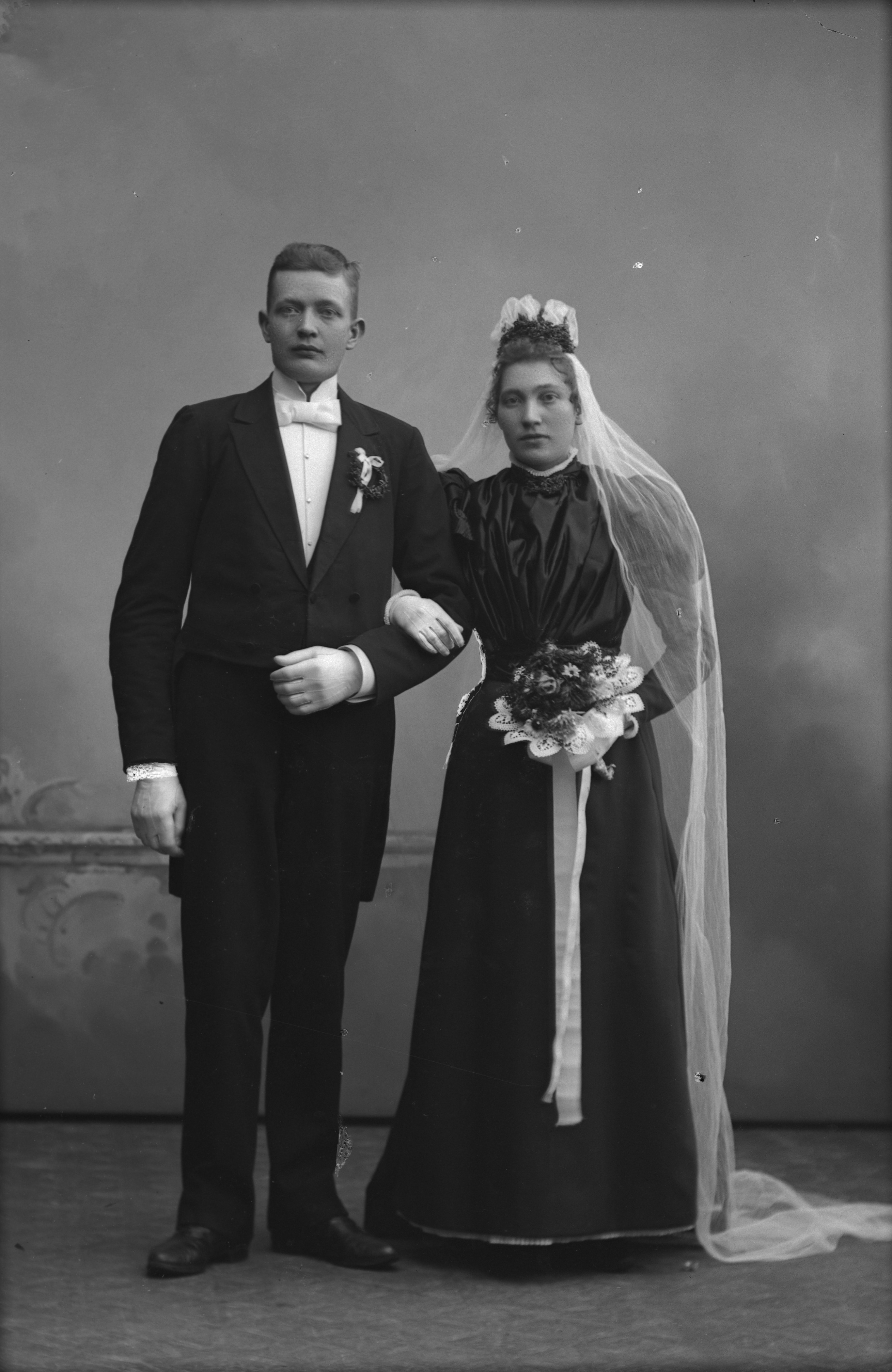 Porträtt i helfigur av J. Vedén med brud /Västra Långgatan.