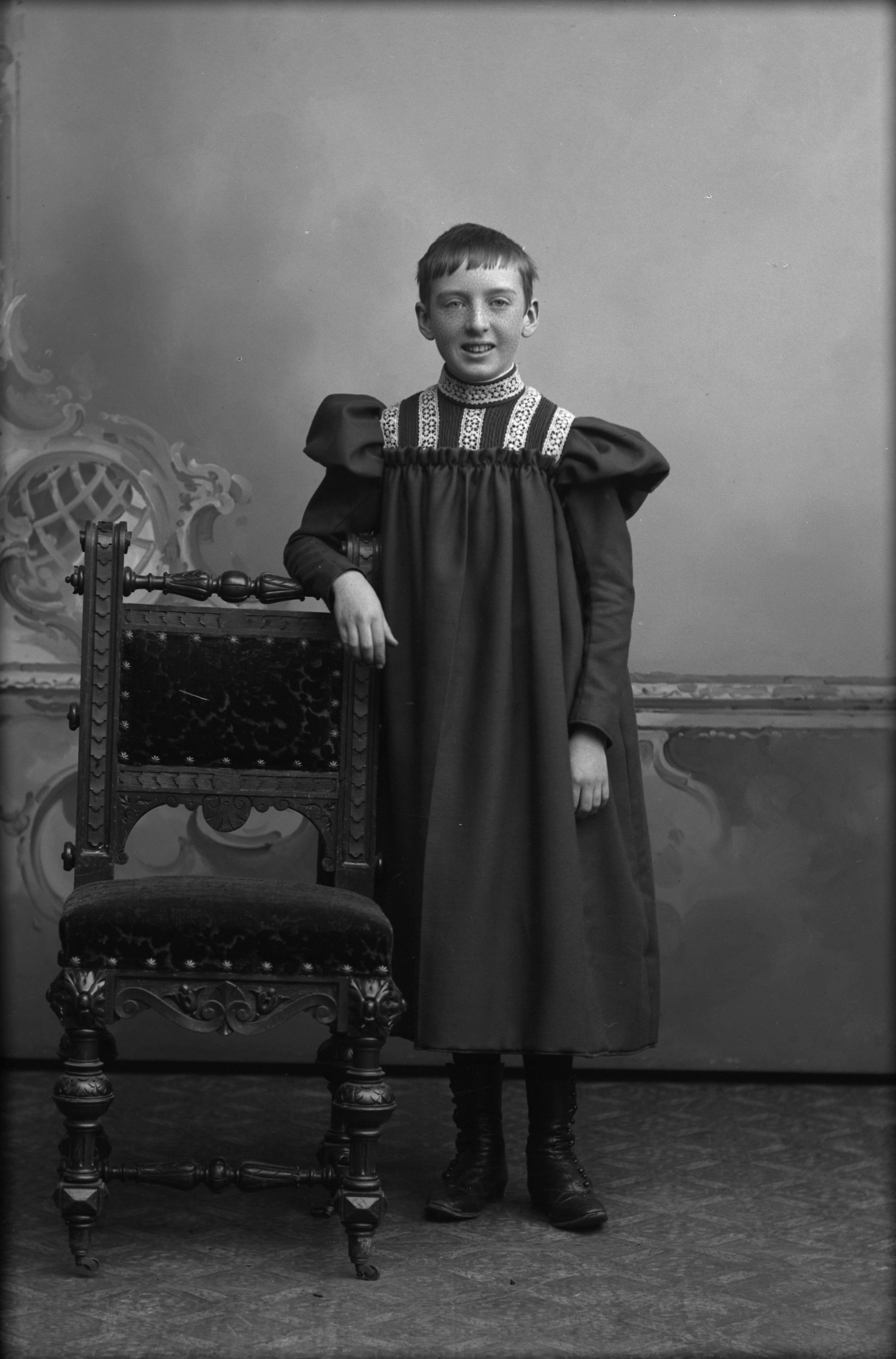 Porträtt i helfigur av Ellen Augusta Maria eller Helga Schweder, stående vid stol.