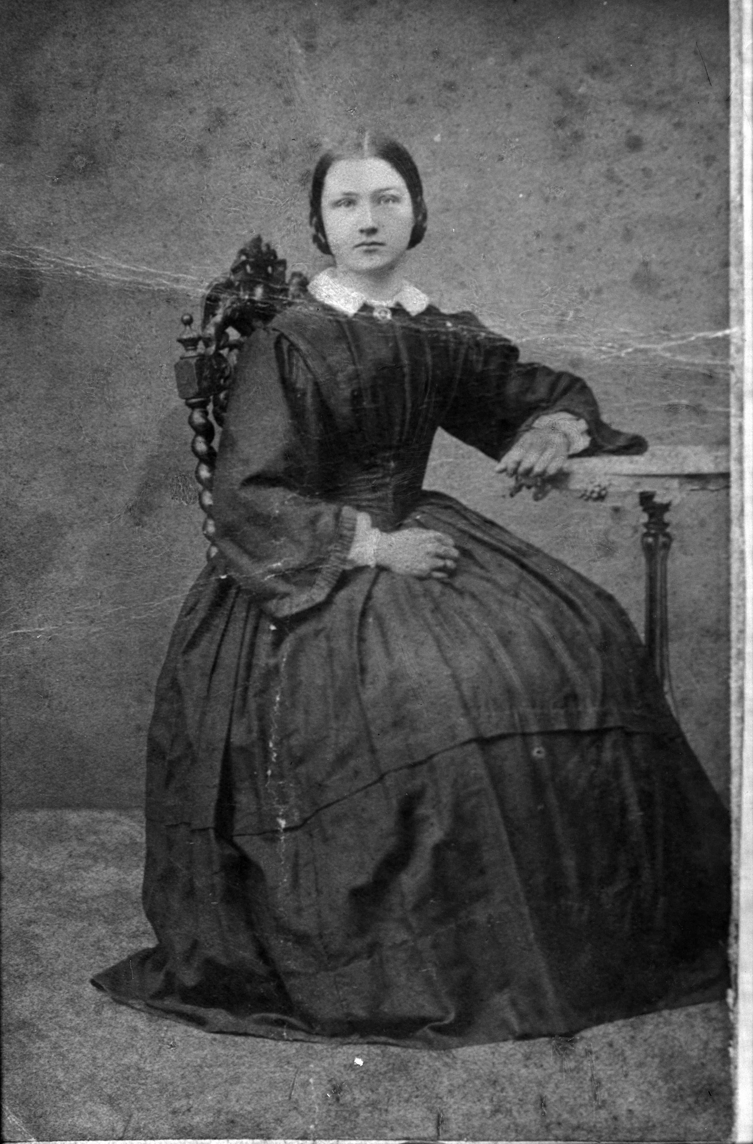 Porträtt i helfigur av oidentifierad kvinna, sittande vid bord.