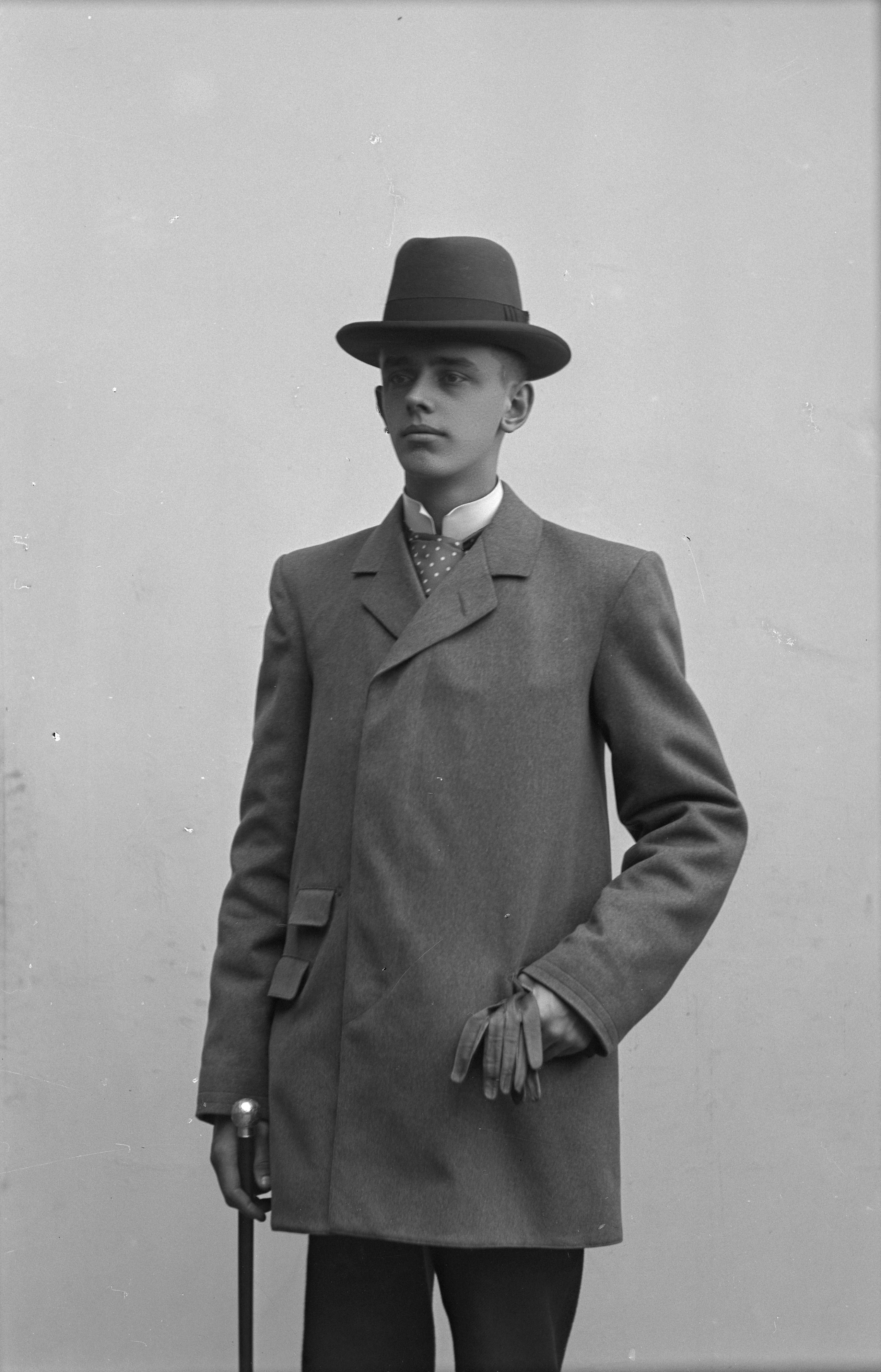 Porträtt i helfigur av T. Lenander, iklädd hatt, hållande käpp och handskar.