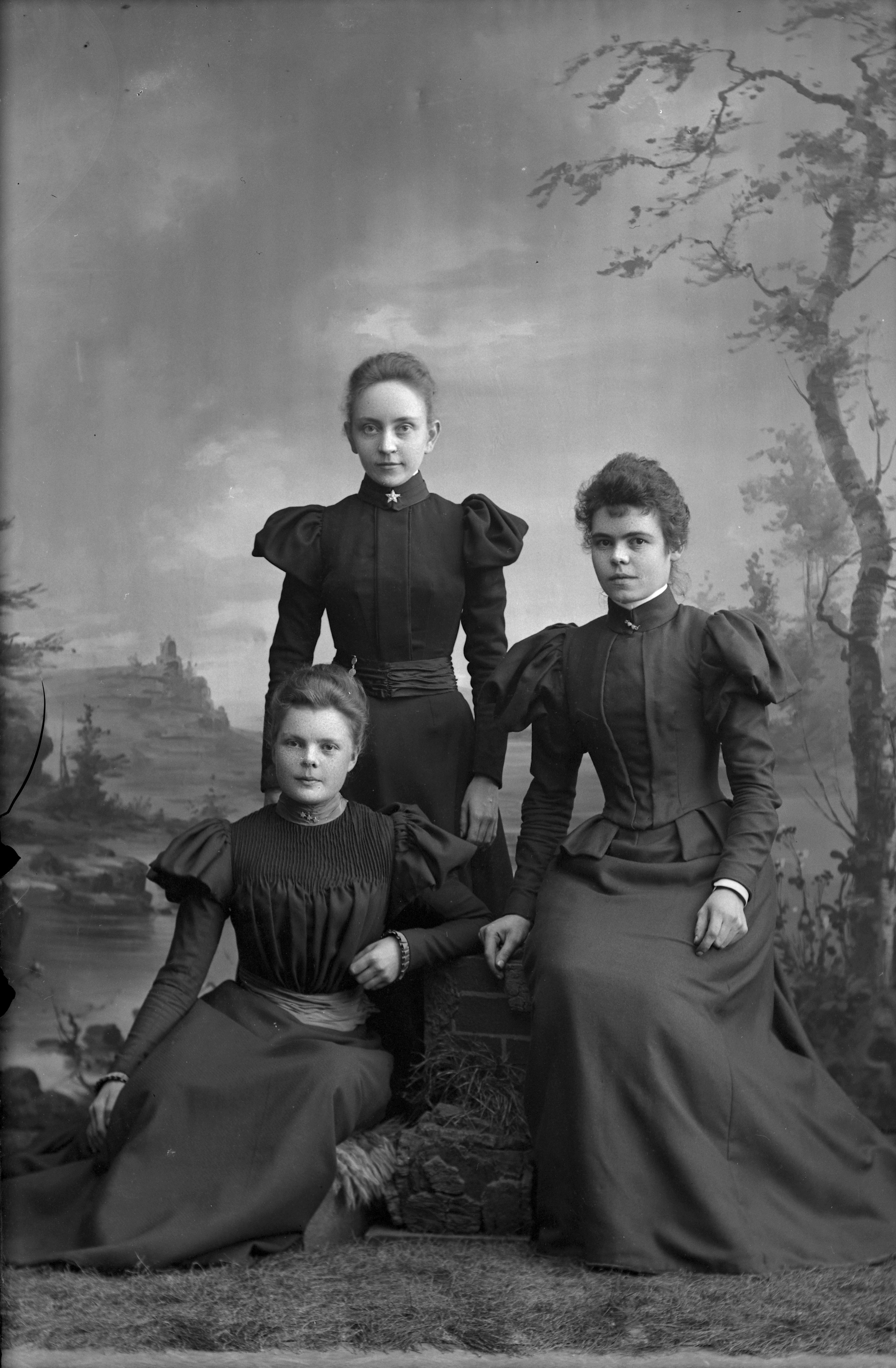 Porträtt i helfigur av Anna Larsson med okänt sällskap, två andra kvinnor, sittande och stående. Fotograferade framför ateljéfond med skogsmotiv.