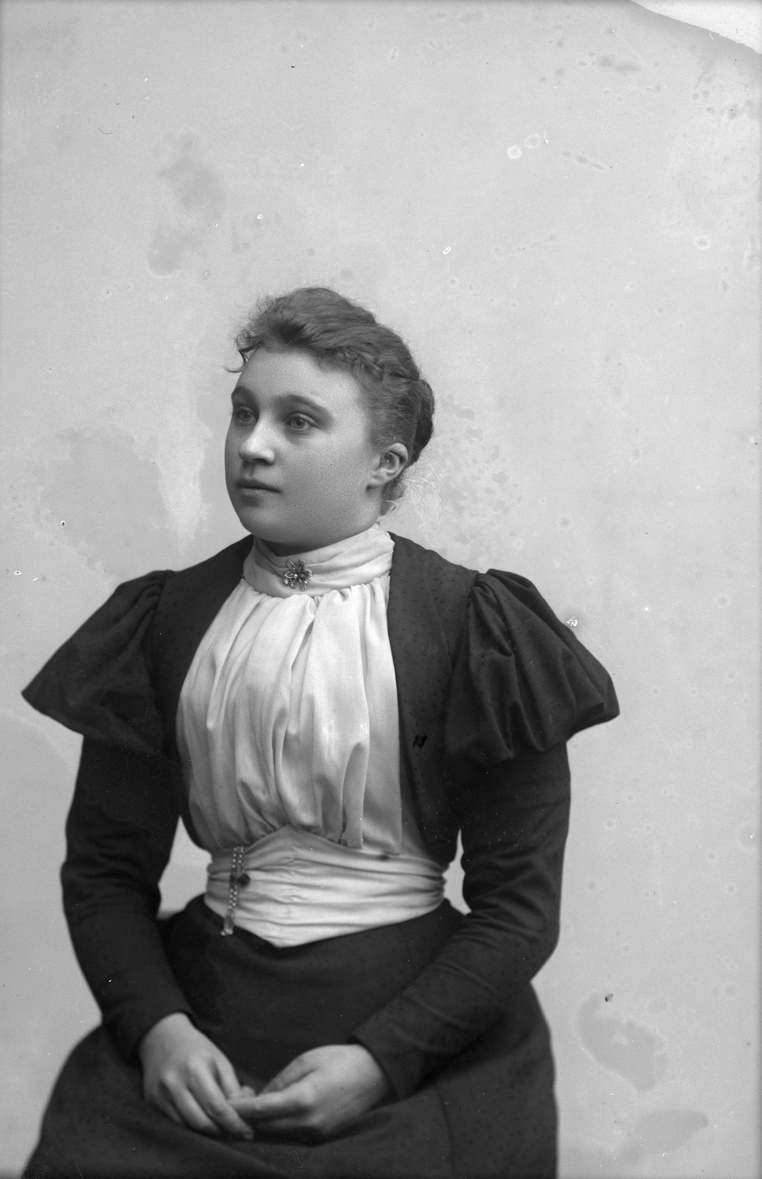 Beskrivning: Porträtt i halvfigur av Betty Nilsson.