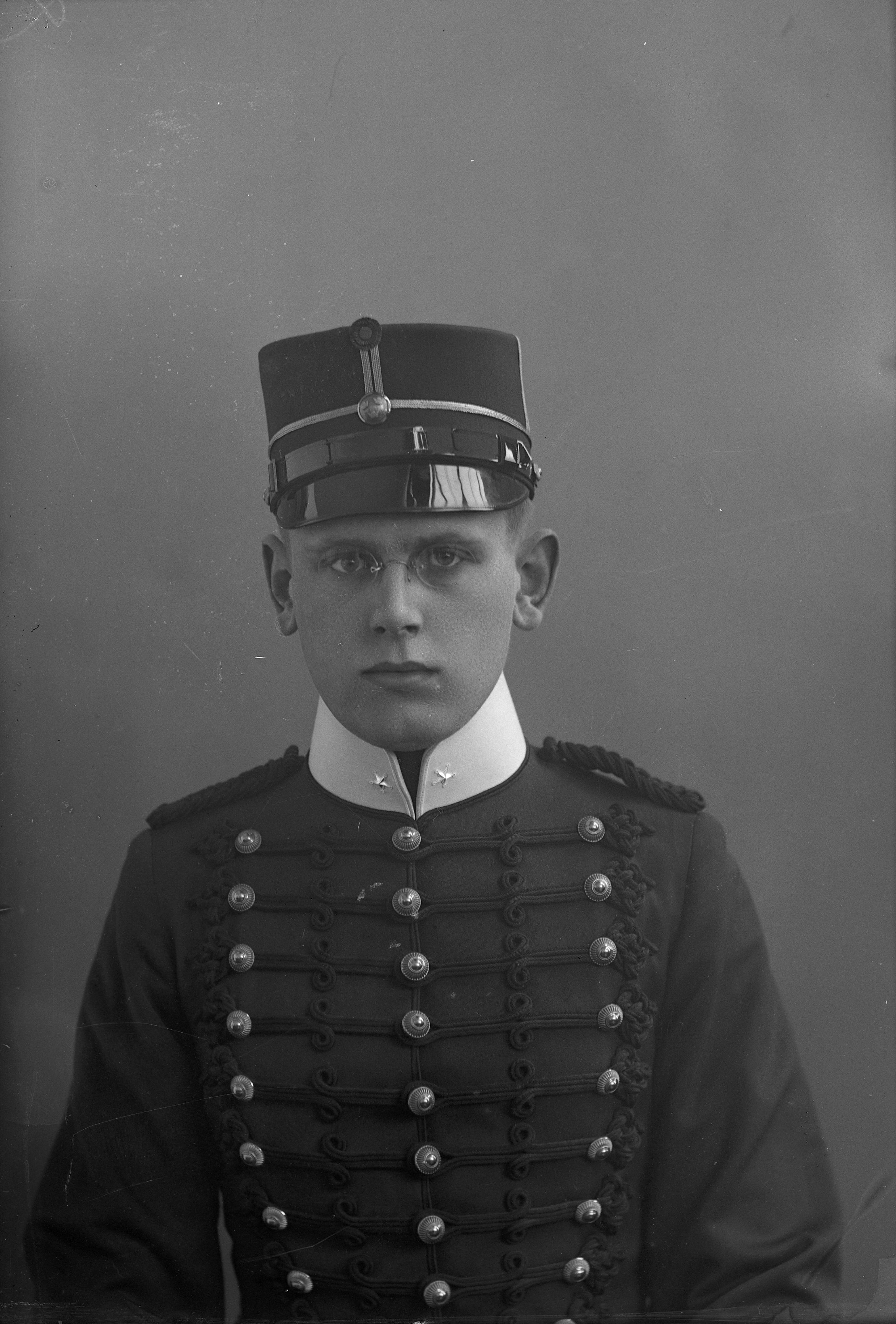 Beskrivning: Porträtt i halvfigur av militären Kockum i militäruniform och -mössa.