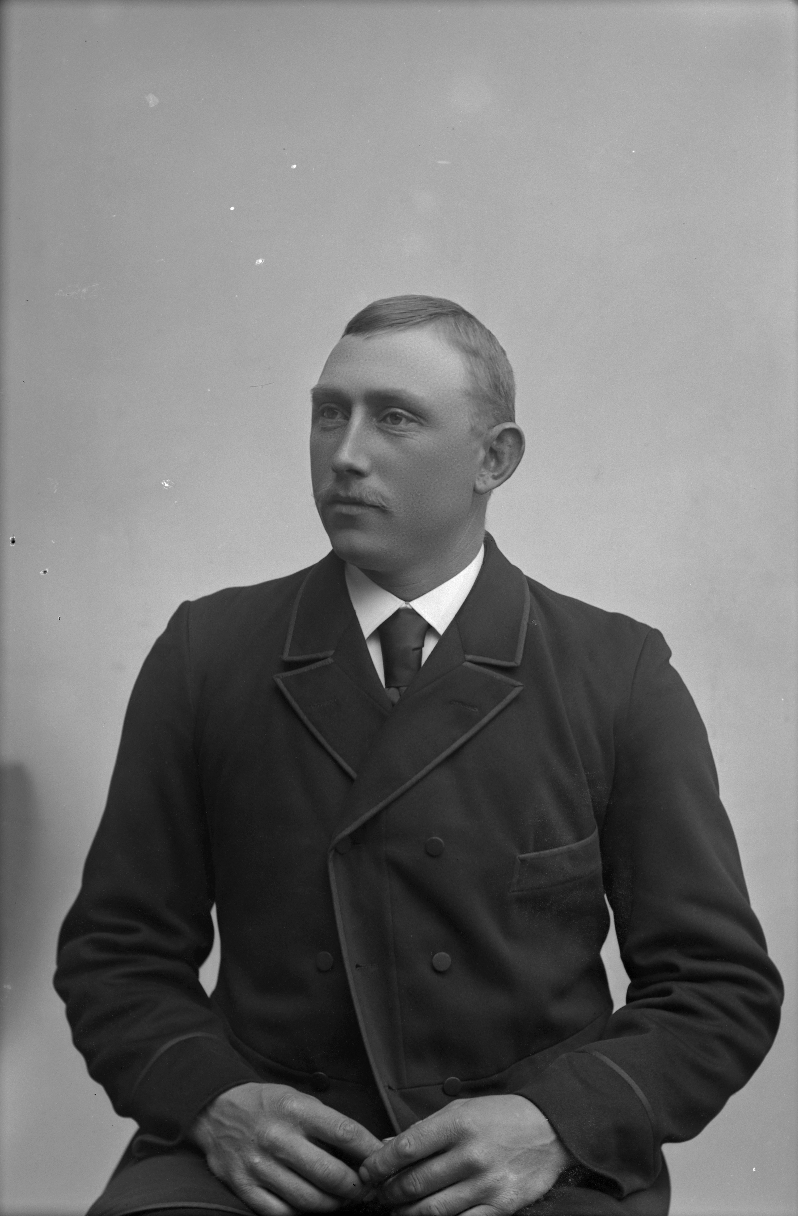 Beskrivning: Porträtt i halvfigur av banvakt Anders Hansson.