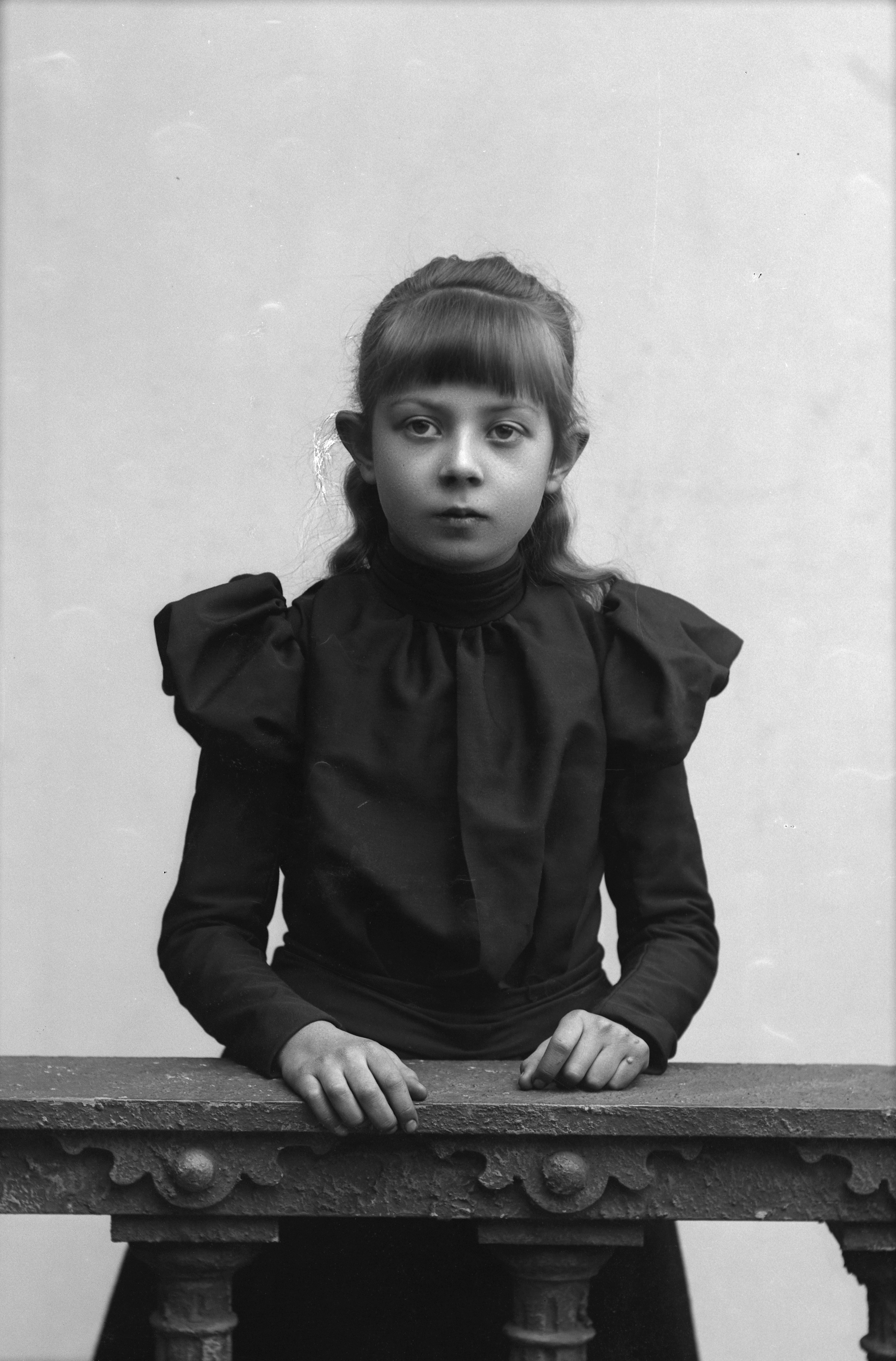 Porträtt i halvfigur av Mia Lindell, stående bakom stenstaket med balustrad.